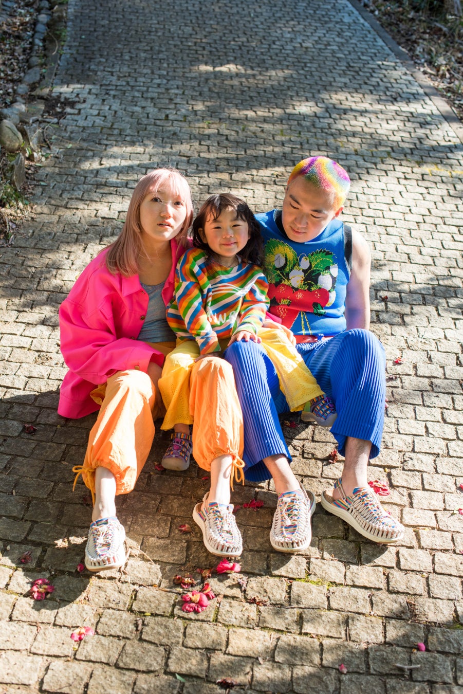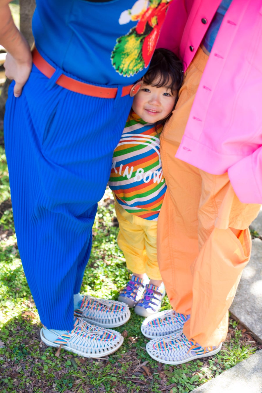誰でも隔たりなく、子どもも大人もみんなが着ることができるというブランドのコンセプトを落とし込んだ、このカラフルなシューズを履いて、是非ハッピーな日常を楽しんでほしいです。