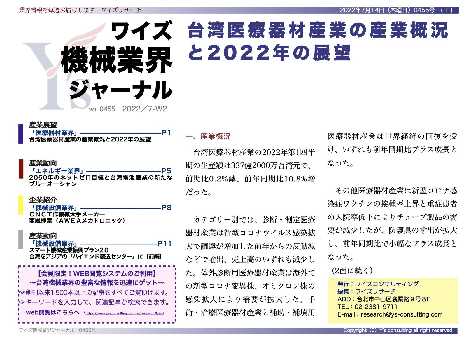 ワイズコンサルティング グループ(本社:中華民国台北市、代表取締役:吉本康志)は台湾機械業界専門誌「ワイズ機械業界ジャーナル」の2022年7月第2週号を発行しました。今週号では、医療器材業界、エネルギー業界、CNC工作機械大手メーカーの亜崴機電(AWEAメカトロニック)、機械設備業界の動向をご紹介します。
