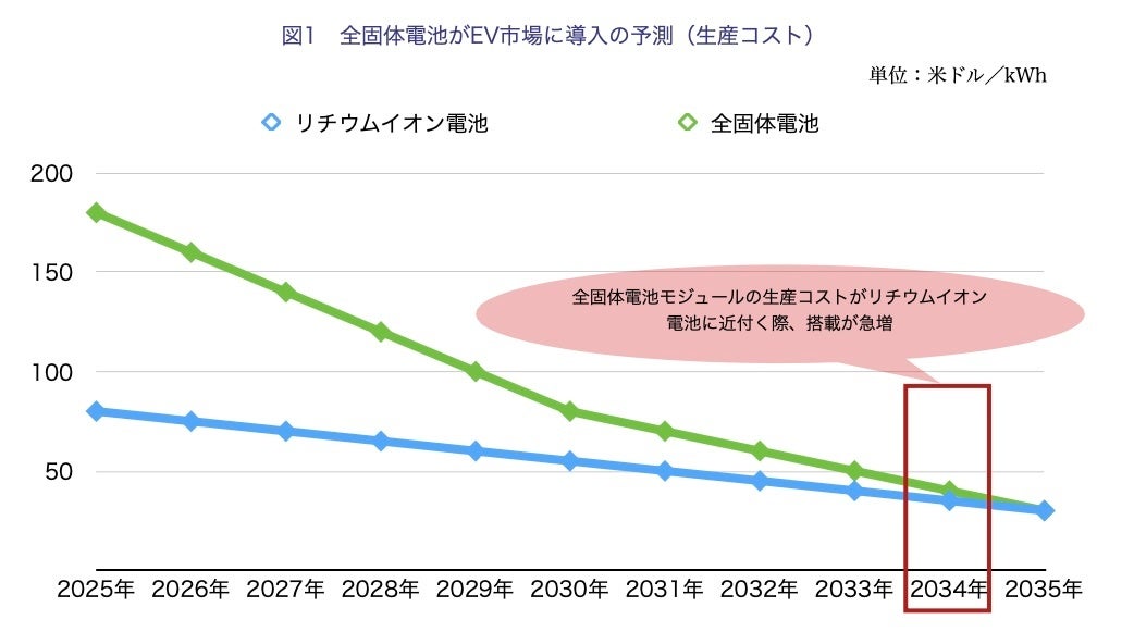 調査会社の米ブルームバーグNEF(BNEF)の予測によると、全固体電池は28年からEVに搭載され始め、全固体電池モジュールの生産コストがリチウムイオン電池に近付く33年以降にEVへの搭載が急増する見通しだ。