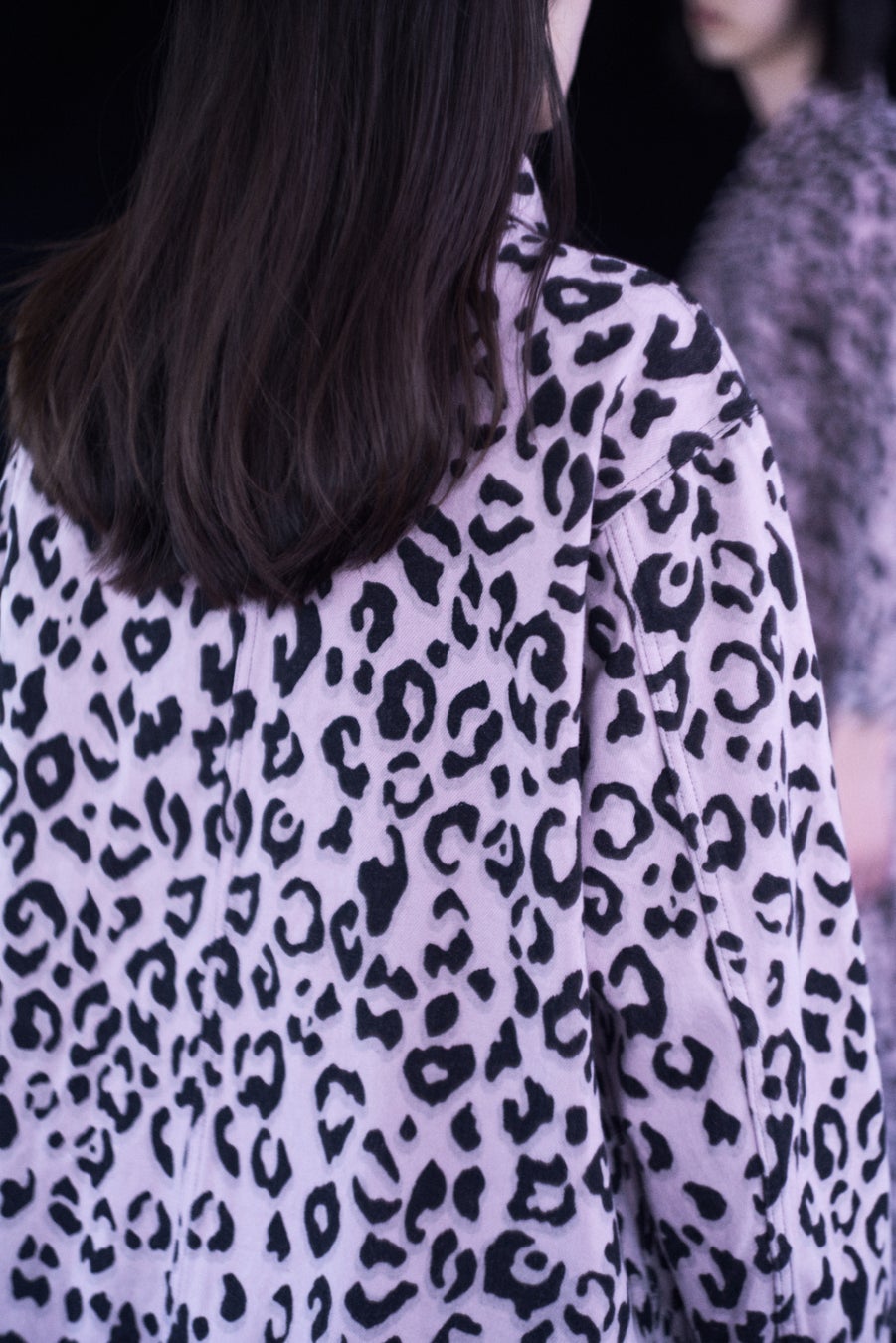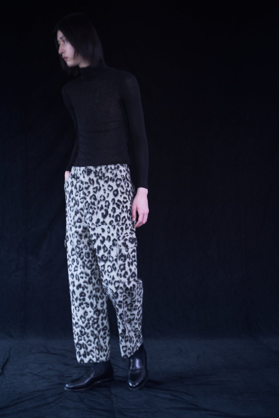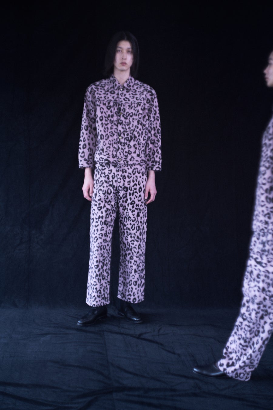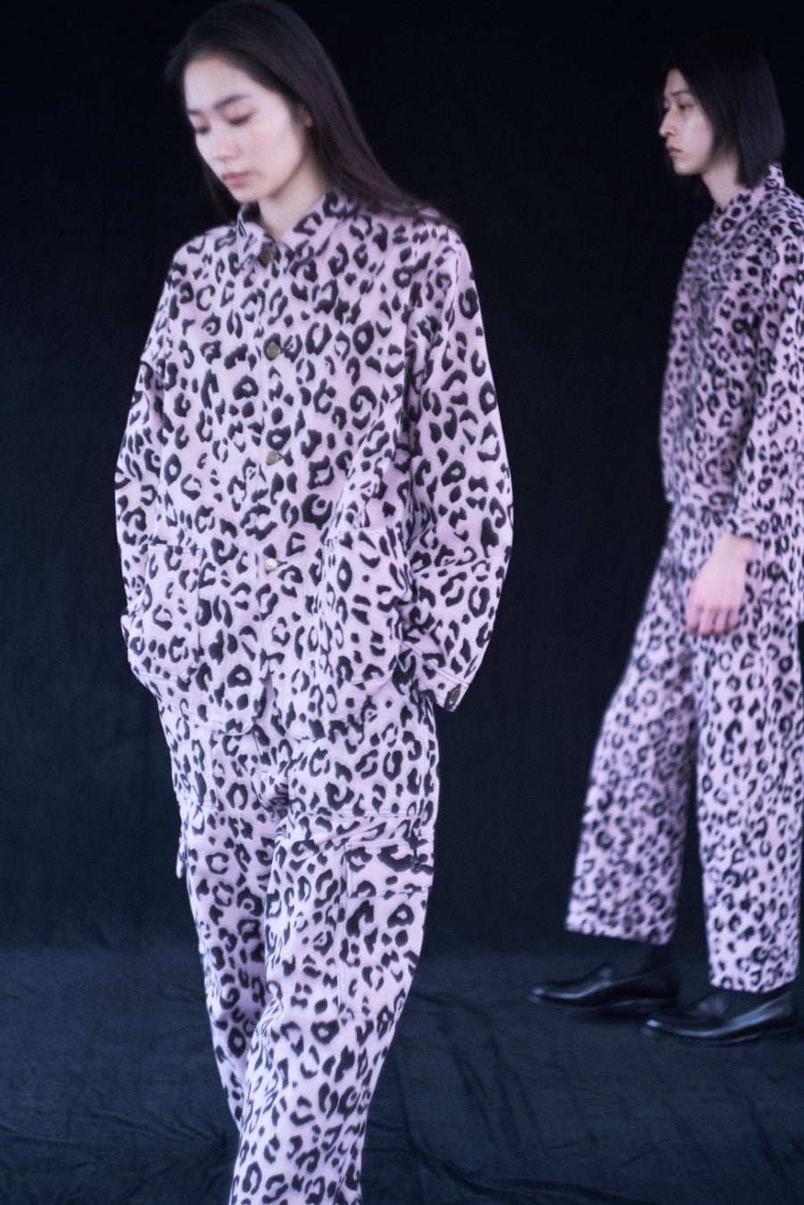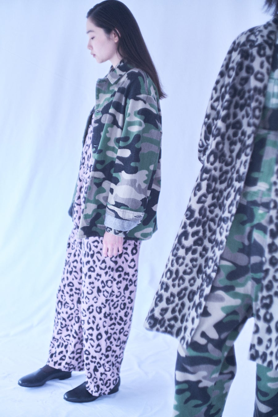 12.5オンスのブラックデニムに型友禅の段落ち抜染や顔料抜染、顔料染めという技法で、カモフラージュとレオパードの2つの柄を表現。