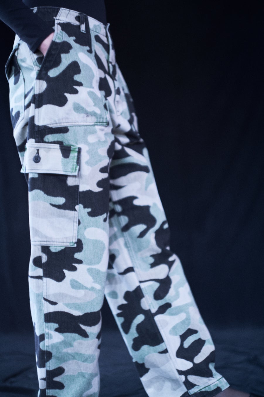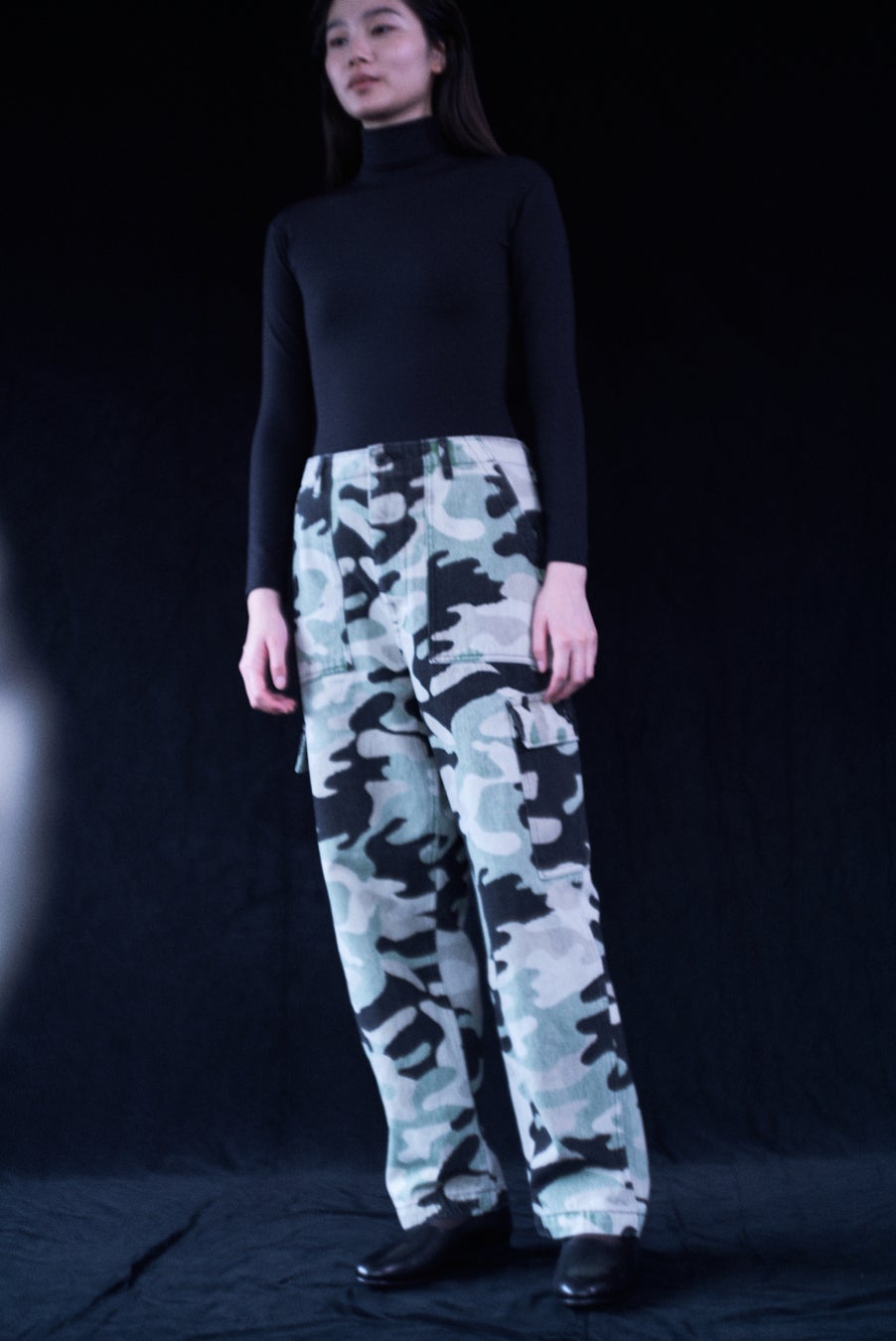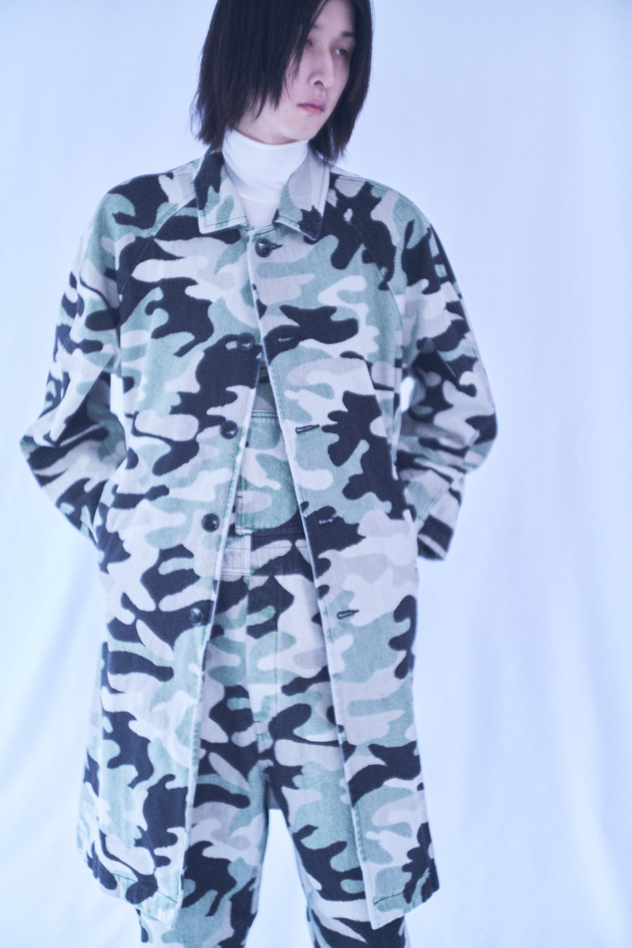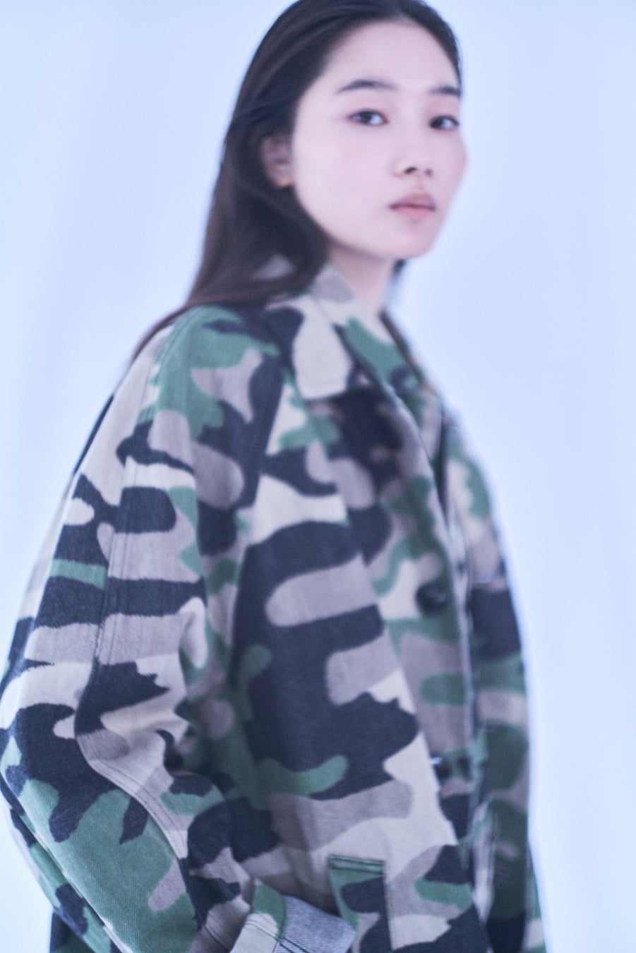 カモフラージュ柄は型友禅を用いて、パーツごとにデニムの色を段落ち抜染しながら部分的に顔料で色を乗せて表現したもの。抜染と顔料抜染を同時に行う繊細な表現は京友禅ならではの職人技です。