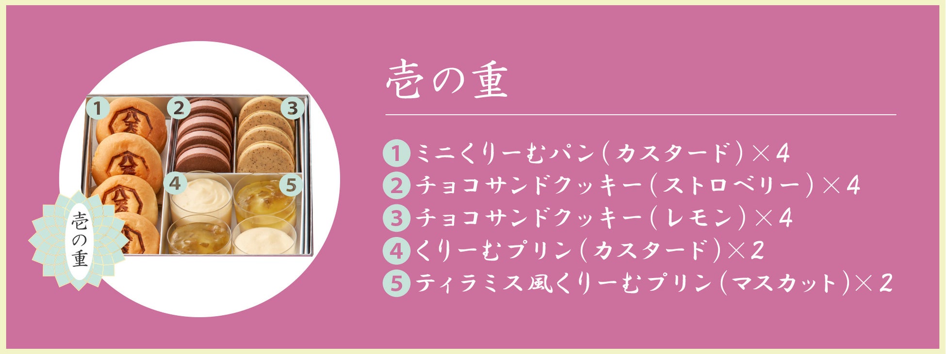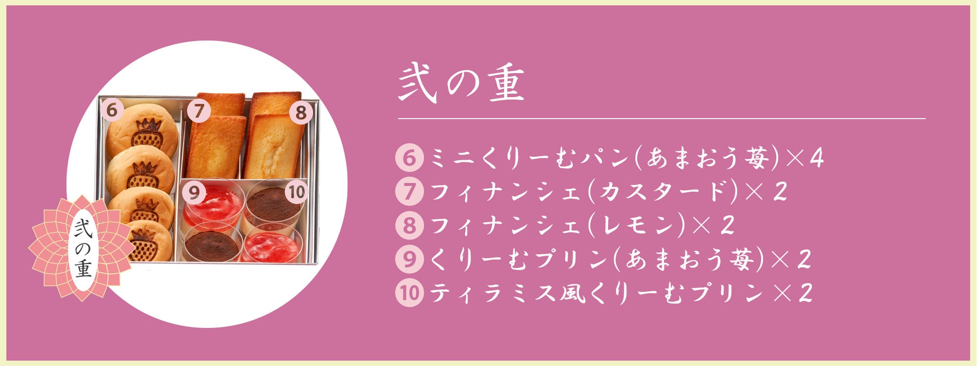 ミニくりーむパン(あまおう苺)×4、フィナンシェ(カスタード)×2、フィナンシェ(レモン)×2、くりーむプリン(あまおう苺)×2、ティラミス風くりーむプリン×2