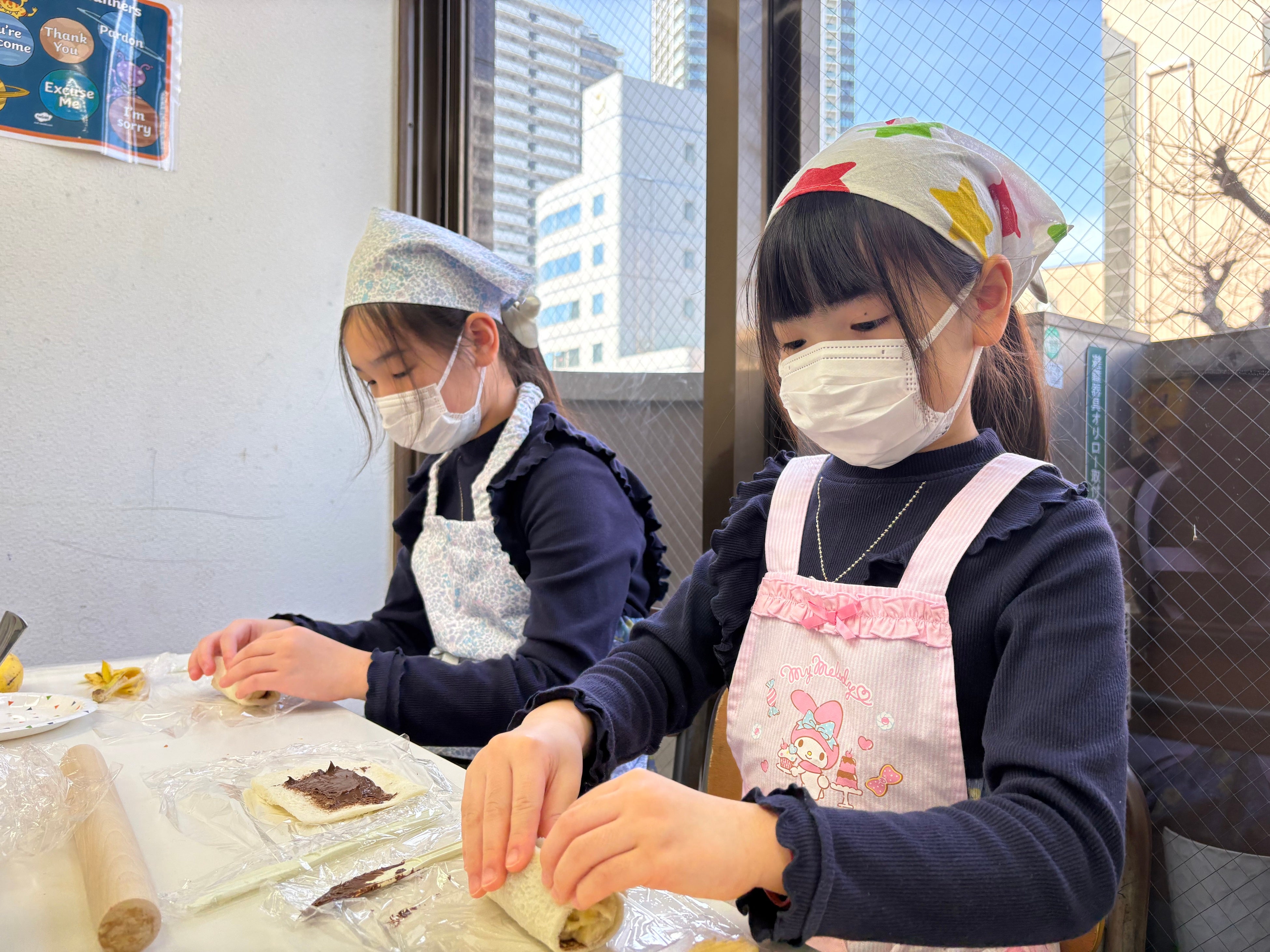 クッキングでは「バナナ寿司」を制作。火や包丁を使わない工程とすることで、子どもたち全員が主体的に参加し、英語を使うことに集中できる環境を実現しました。ランチタイムには外国人講師と食事を囲み、食べ物の好みや春休みの予定などについて英語で会話が広がり、日常に近い自然なコミュニケーションが生まれました。