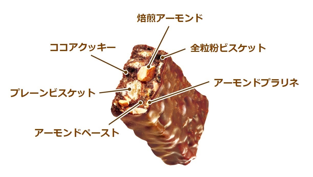 昨年よりも焙煎アーモンドの使用量を14%増量し、アーモンドの食感や香ばしさがアップ。また、チョコレートをアーモンドと相性の良いミルク感の強いものに変更することで、より一層【アーモンド×チョコレート】のおいしさが引き立つ仕様にしております。隠し味に、アーモンドの香ばしさを引き立てる「コーヒー粉末」を採用し、おいしさにさらなる深みを出しています。