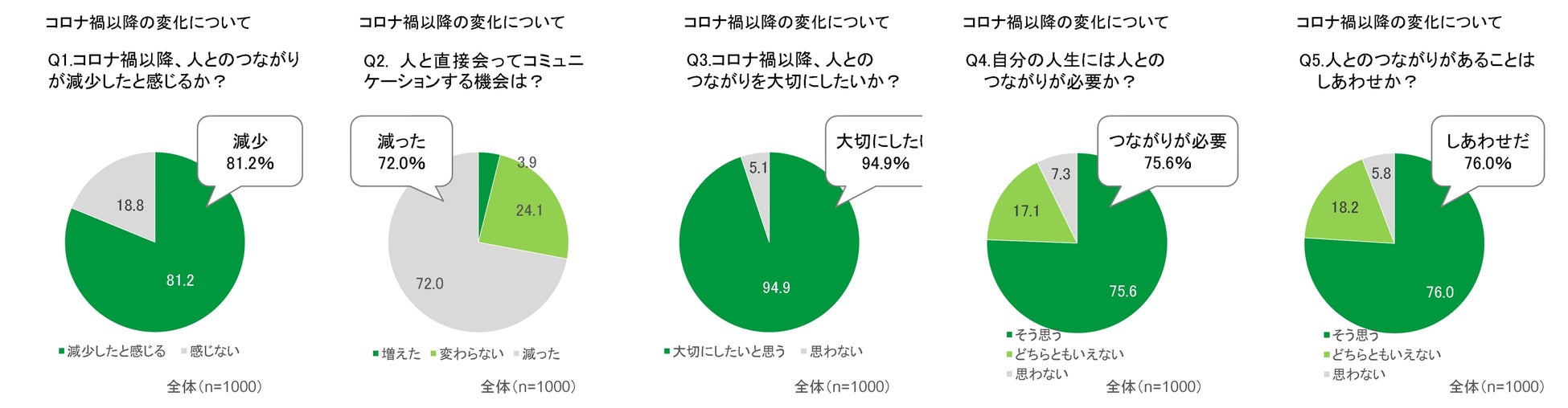 コロナ禍以降、全体の81.2%が人とのつながりが「減少した」と感じ、72.0%が人と直接会ってコミュニケーションすることが「減った」と感じています。その一方で、全体の94.9%は「人とのつながりを大切にしたい」と回答しています。また、全体の4人に3人は「自分の人生には人とのつながりが必要だ」(75.6%)、「人とのつながりがあることはしあわせだ」(76.0%)と回答しました。