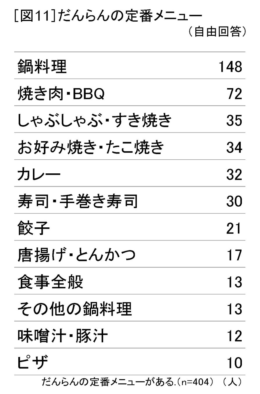 また、ランキングには入りませんでしたが、「実家へ帰ったときの父親の釣ってきた鯛(たい)を使った鯛めしと豚汁とサラダ」や「自宅で採れる筍(たけのこ)とマグロのカマを一緒に煮た母親の自慢料理」など家族が釣ったり採ったりした食材を生かしただんらんメニューや、「子どもと一緒に作ったカレーなどの料理」「手作りのお節を家族で囲むとき」など、家族で一緒に作ったり食べたりするシーンも挙げられました。