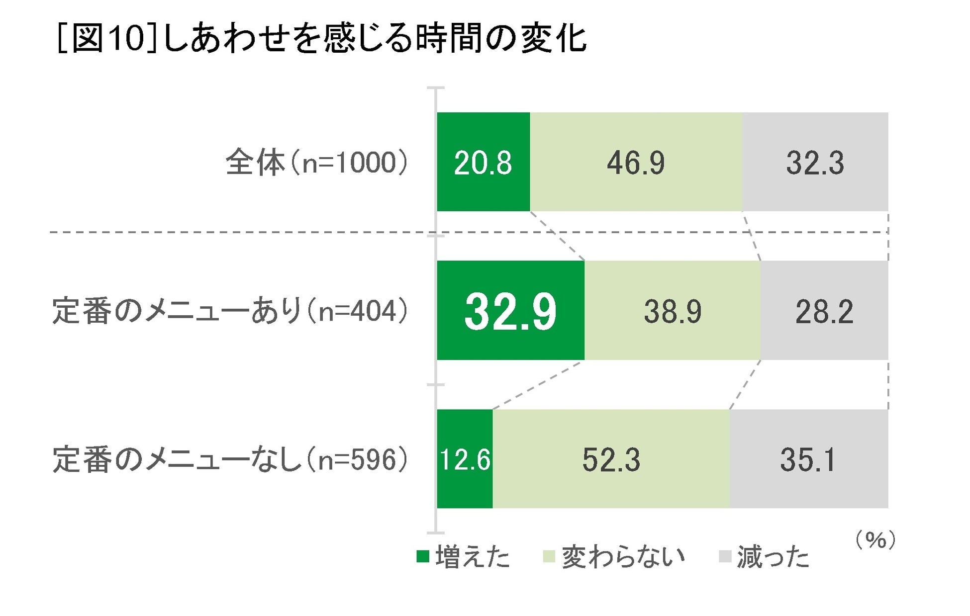 また、ここ数年のしあわせを感じる時間の増減を聞くと、しあわせを感じる時間が「増えた」と答えた人は、コロナ禍の影響もあるのか全体で2割(20.8%)でした。しかし、定番メニューがある人では32.9%と全体平均より12ポイントも高くなっています[図10]。だんらんの定番メニューがある人は、しあわせ度も高く、しあわせを感じる時間も増えやすいようです。