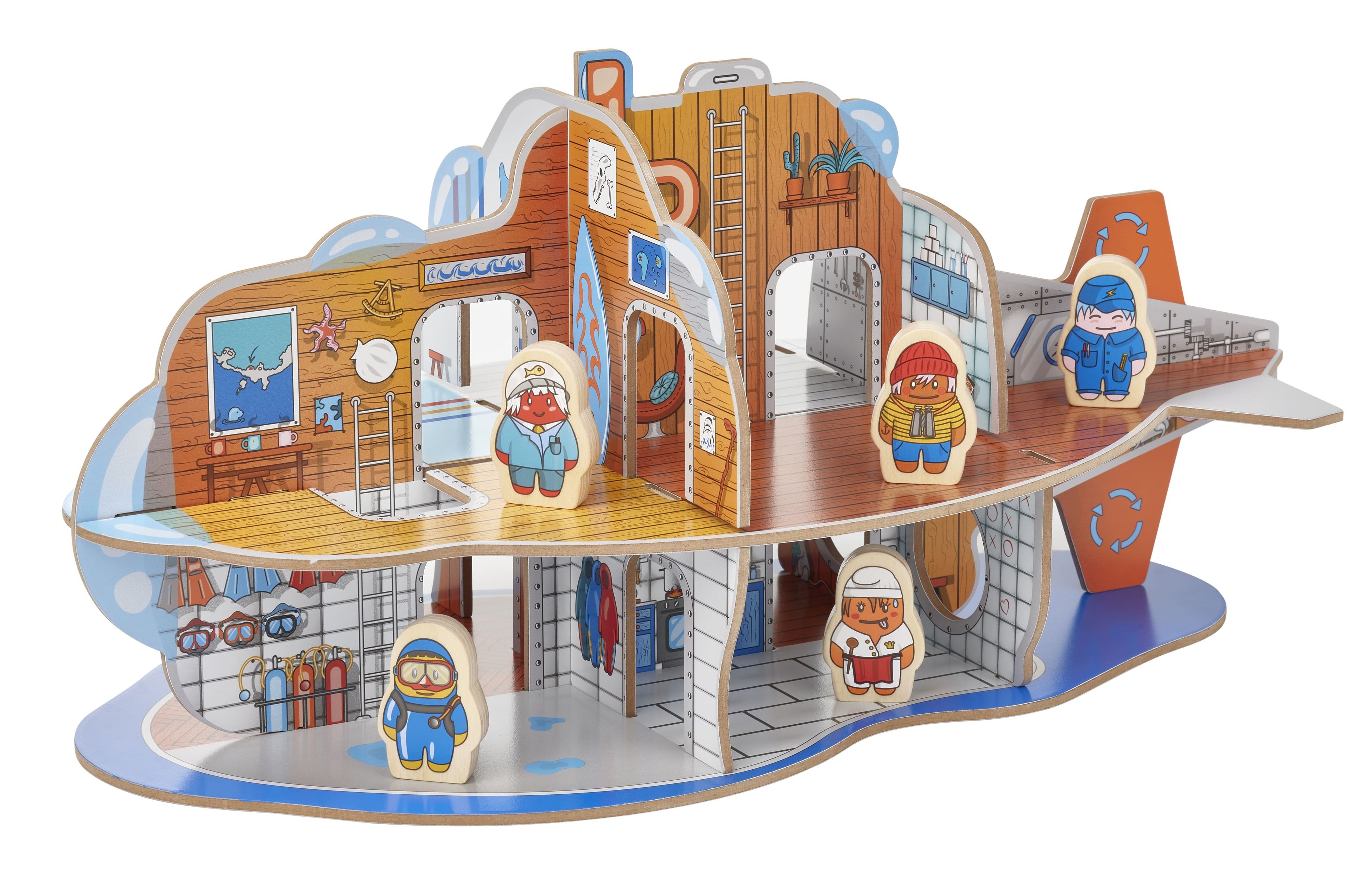 中が見える潜水艦!いろんなことができる部屋に分かれています。5種類のキャラクターを使って、部屋の中の細かいディテールを説明したり、再利用やリサイクルによって海洋汚染を防ぐ方法について教えてあげたりして遊びましょう。