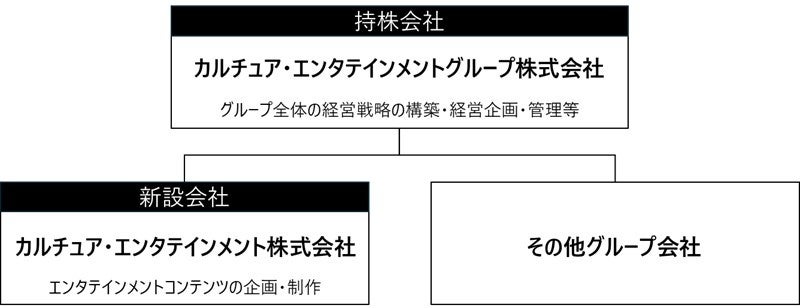 CEは、商号を「カルチュア・エンタテインメント グループ株式会社」へ変更し、グループ全体の経営戦略の構築、経営企画・管理などを行う持株会社となります。なお、映像、出版、IPプロダクトなど各事業の承継先である新設会社は、従来と変わらない社名(カルチュア・エンタテインメント株式会社)で展開致します。
