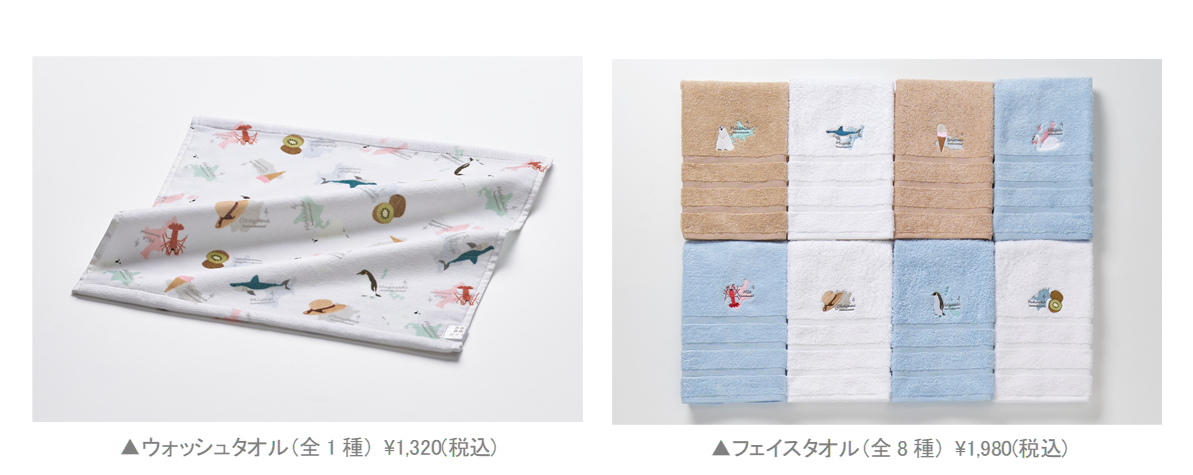 「北海道」「宮城県」「埼玉県」「新潟県」「三重県」「岡山県」「福岡県」「長崎県」の全8エリアを、「クリアケース小」「クリアケース大」「ウォッシュタオル」「フェイスタオル」「トートバッグ」の5つのアイテムで展開します。