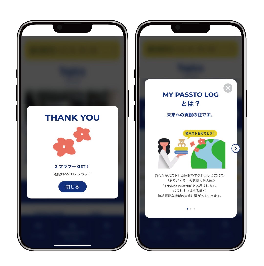 「MY PASSTO LOG」は、「宅配PASSTO」を利用して不要品を手放した回数やアクションに応じて、感謝の気持ちを込めた「Thanks Flower (サンクスフラワー)」が付与される機能です。一人ひとりのアクションが、意識をしなくても自然と地球のより良い未来につながっていることを可視化し、捨てない社会につなげます。