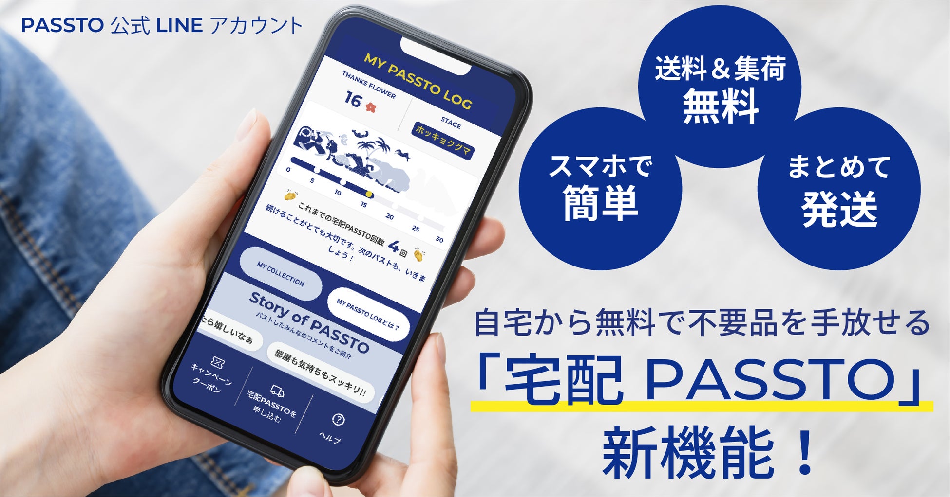 自宅から無料で不要なものを手放せる「宅配PASSTO(パスト)」、循環アクションを可視化するリワード機能と、回収内容に応じてお得なクーポンがもらえるキャンペーン機能を追加