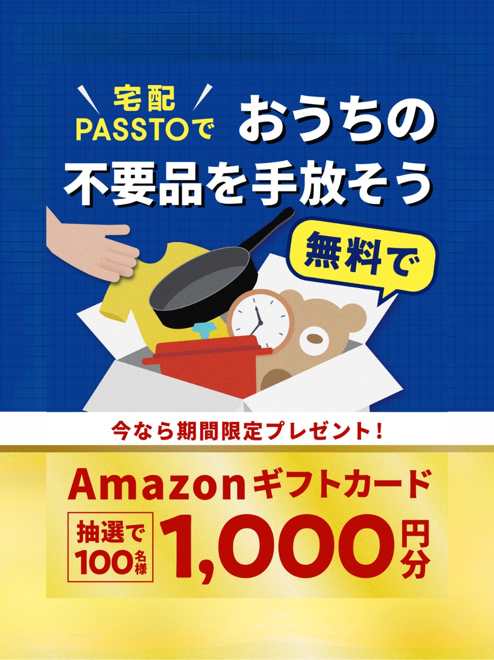 年末おそうじキャンペーンの期間中にPASSTO公式LINEから「宅配PASSTO」で不要品を手放してくださった方に、抽選100名様にAmazonギフトカード1,000円分をプレゼントいたします。