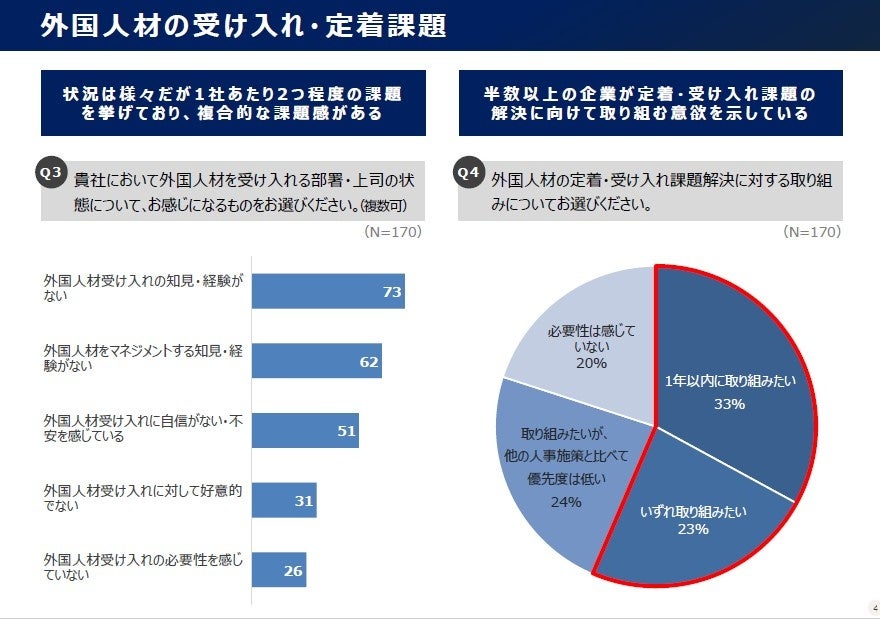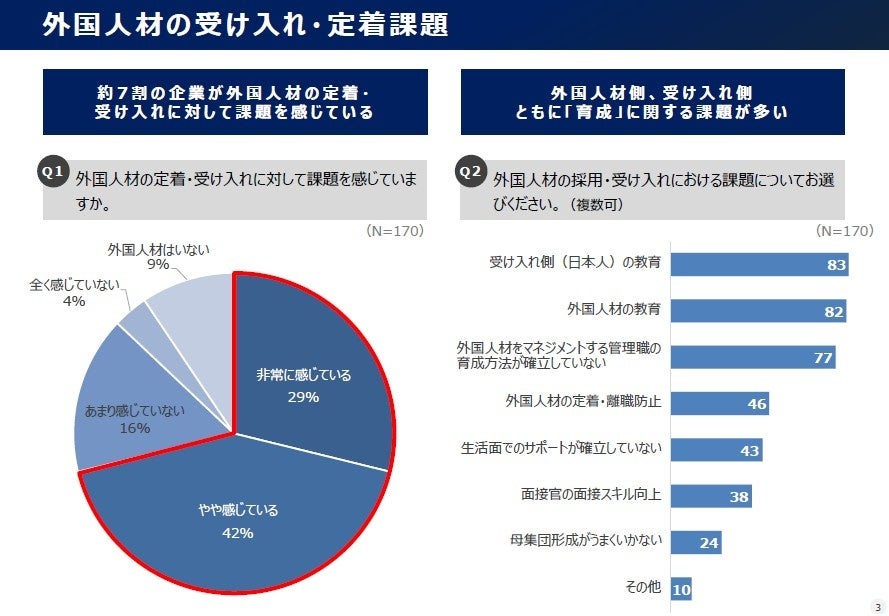 約7割の企業が外国人社員の定着・受け入れに対して課題を感じており、半数以上の企業が定着・受け入れ課題の解決に向けて取り組む意欲を示していることが明らかになりました。