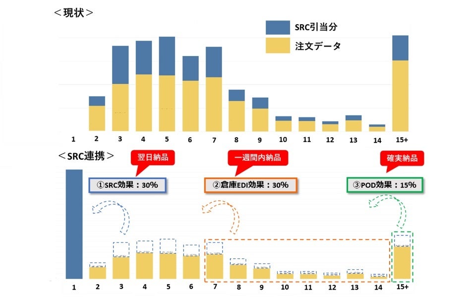 現在両社で、赤羽SRC未利用の書店店舗の注文データを共有・分析し、赤羽SRCの時系列在庫データに引き当てて試算したところ、注文から書店納品までのリードタイムの改善やPOD製造での商品供給で課題解決に繋がる以下の効果が見られ、データを共有した対象書店からも評価を得られました。
