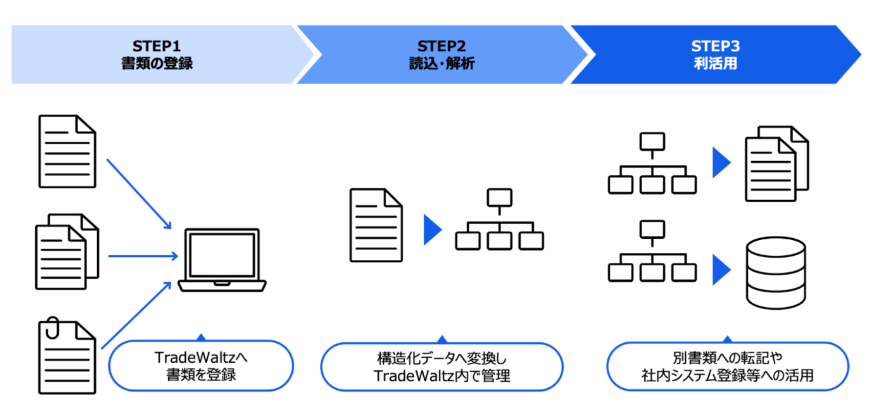 貿易プロセスではステークホルダー間にて多くの書類がやり取りされていますが、未だに紙・PDF形式が主流です。そのため、書類の作成業務や転記・確認に多くの工数が割かれているのが現状です。TradeWaltz®︎ではPDFの保管やステークホルダー間での連携機能を提供しておりますが、ユーザーから「保管しているPDFをデータ化し、他の書類作成や申請に活用したい。」とのお声が多く寄せられたことから、当該機能を開発・提供することといたしました。