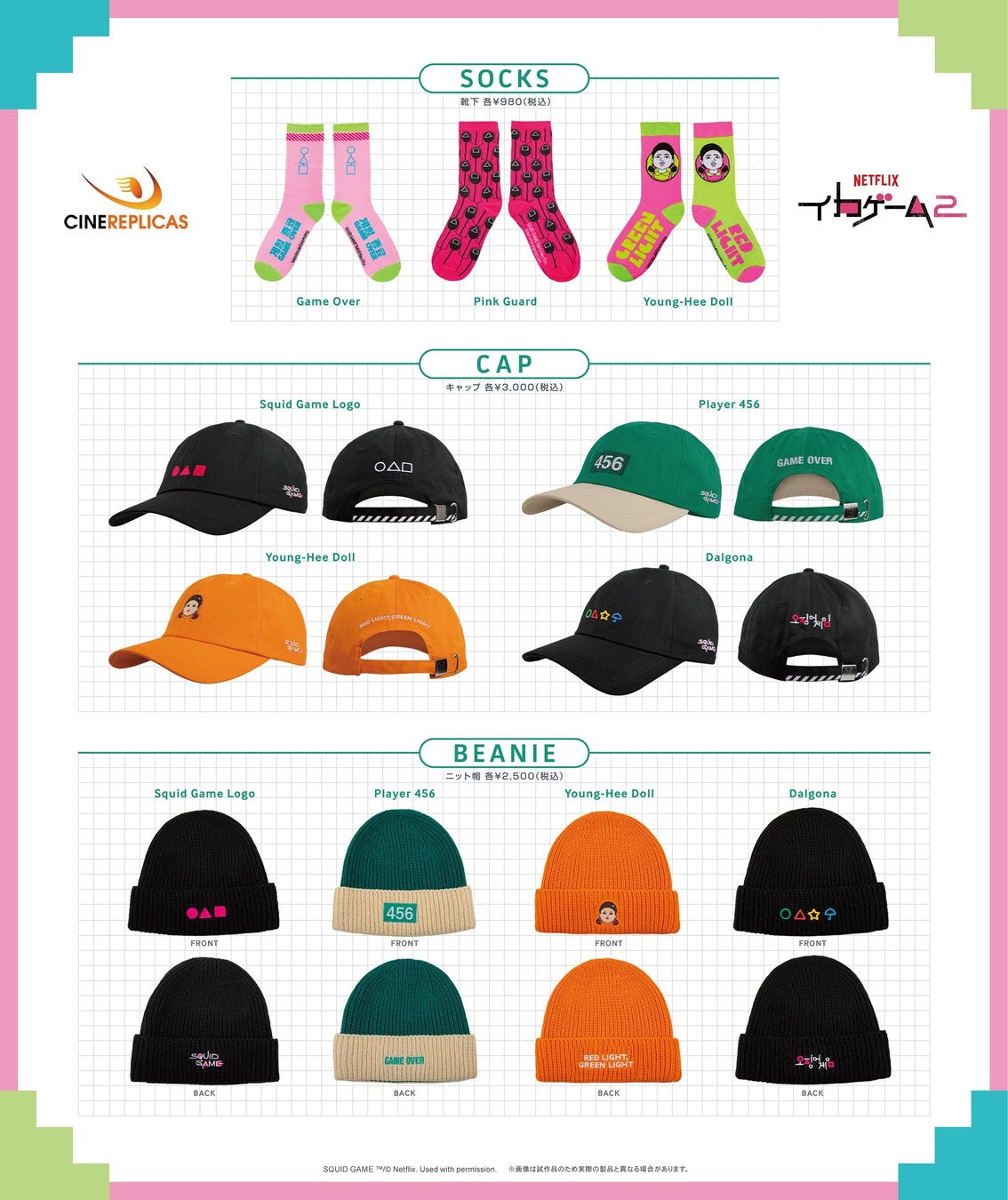「シネレプリカ」からは、カラフルなデザインが特徴的な靴下、キャップ、ニット帽が登場!ロングTシャツ/Tシャツと合わせたモチーフでコーディネートすることもできます。
