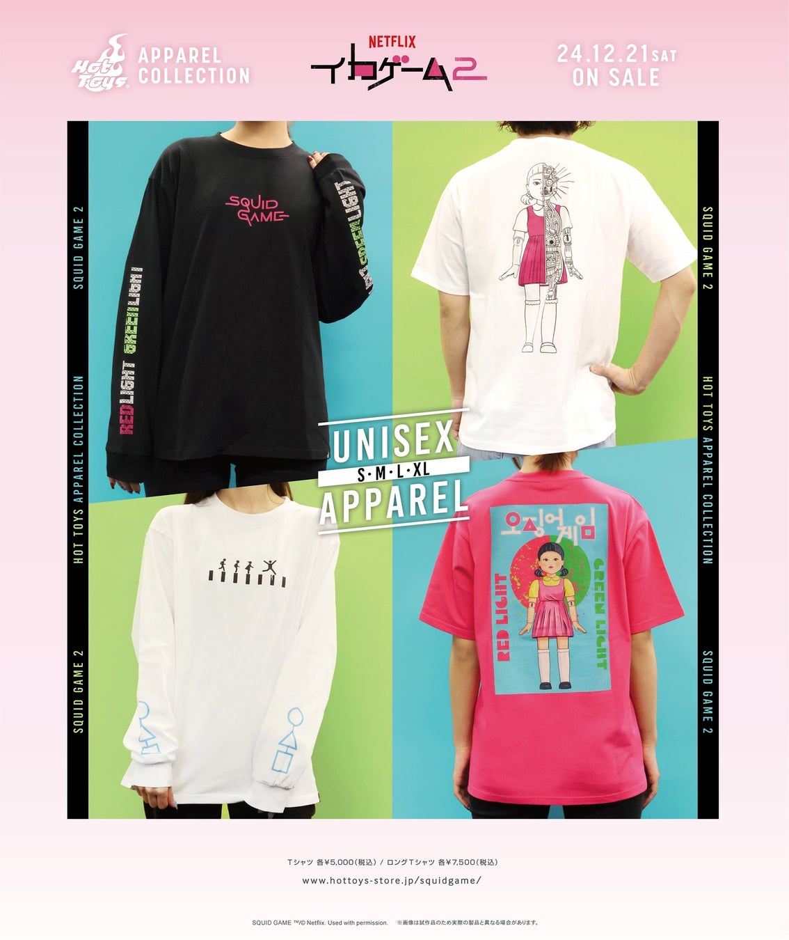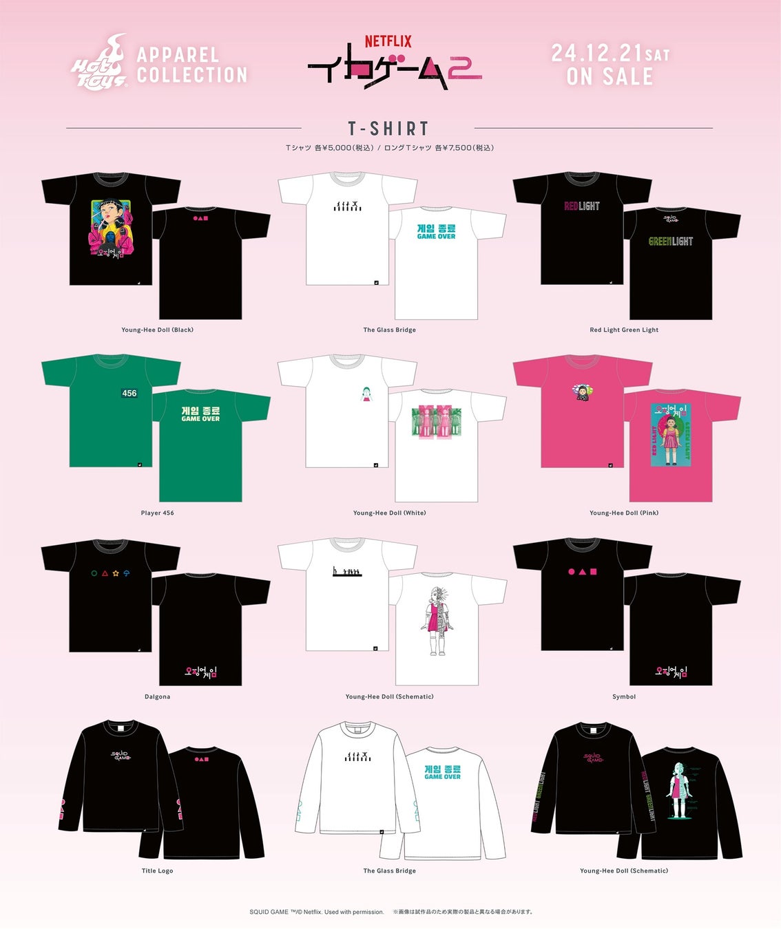ホットトイズのフラッグシップ・ストア「トイサピエンス」が展開している「ホットトイズ・アパレル」からは、『イカゲーム』のさまざまなモチーフがデザインされたロングTシャツとTシャツの全12種類がラインナップ。サイズは全てS~XLのユニセックスです。