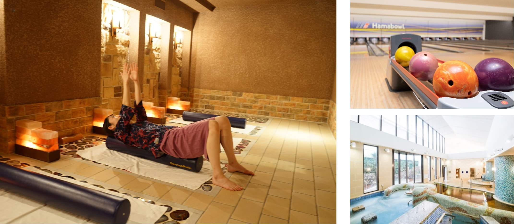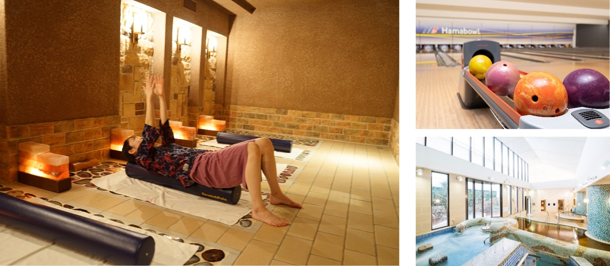 内容:ボウリングカリキュラム(準備体操、ボウリング 2 ゲーム)※同ビル8階にある「ハマボール」にて実施、入浴(温泉、炭酸泉、アトラクションバス)、サウナ、外気浴等