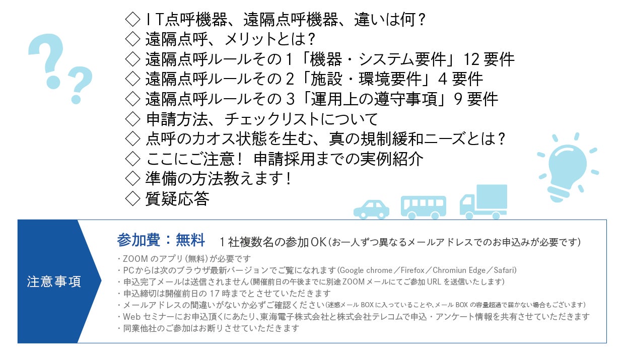 ■詳細はこちらから:【テレコム×東海電子】共催Webセミナー遠隔点呼申請のツボ教えます!