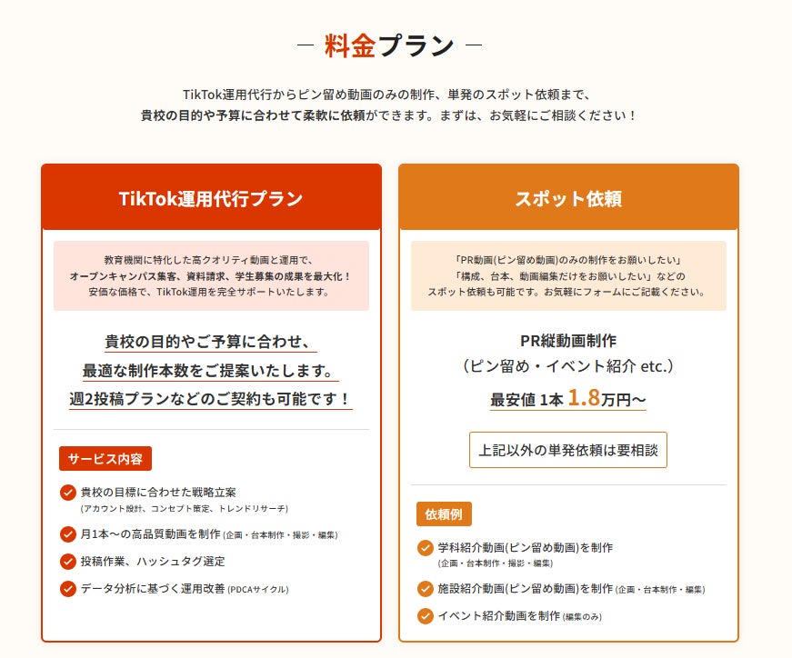 「大学・専門学校に特化したTikTok運用プラン」の特長