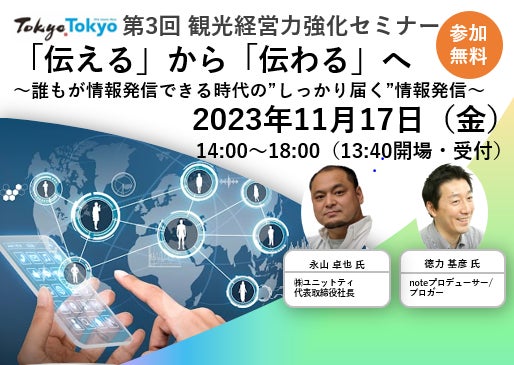 当日は、講師として、地域ビジネスや自治体・団体のデジタルマーケティング支援やコンサルティングを手掛ける、株式会社ユニットティ代表取締役社長の永山卓也氏と、noteプロデューサーでブロガーの徳力基彦氏が登壇し、「お客様の行動につながる情報の伝え方」と、「観光事業者は、noteやSNSを仕事にどう活かすか」をテーマに講演します。