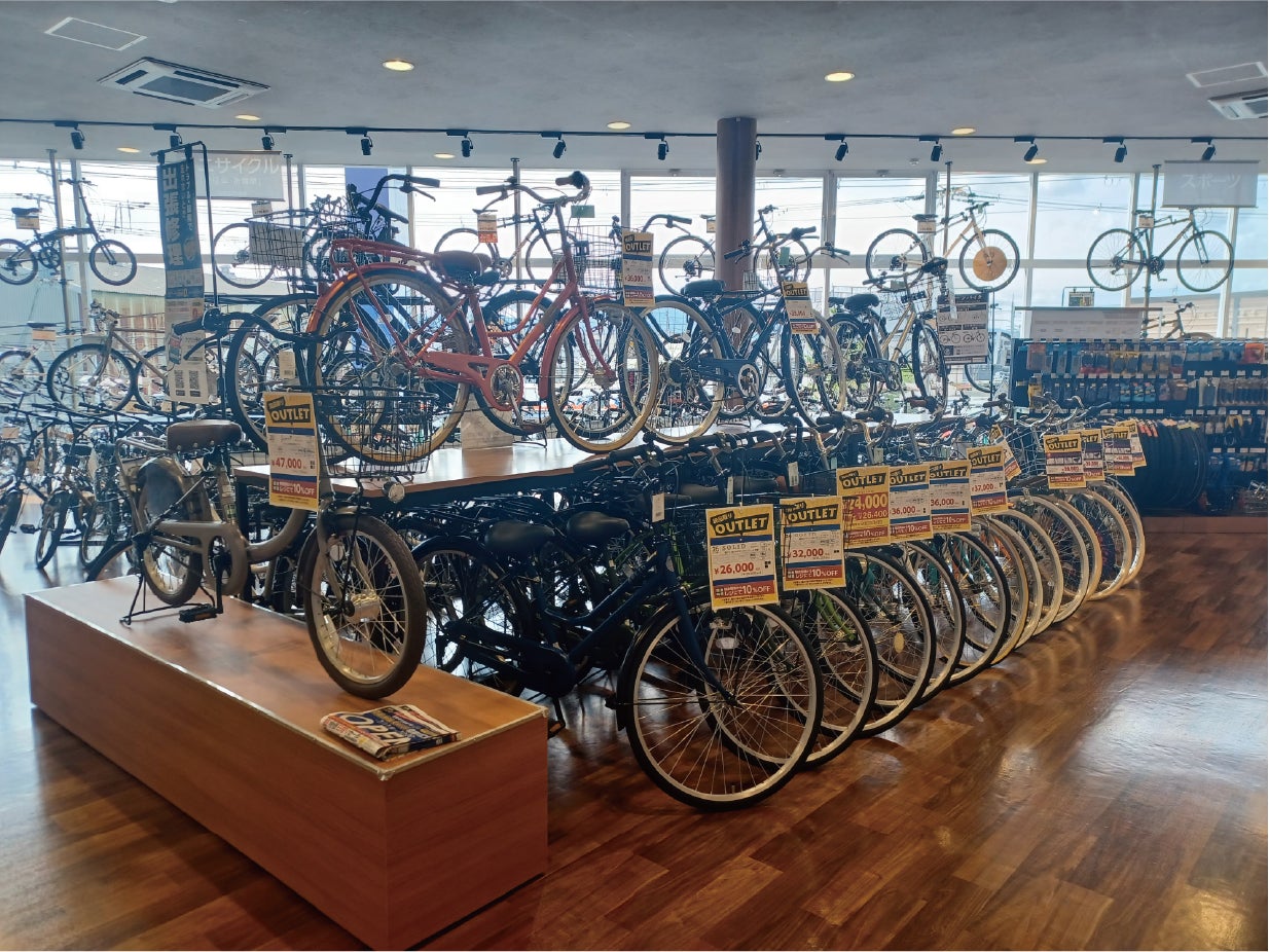 また、2階ではダイワサイクルの通常の店舗ではお取り扱いのないアウトレットコーナーを常設しており、現品限りのシークレット自転車を大特価でご用意しております。数に限りがございますので、是非お早めにお越しくださいませ。