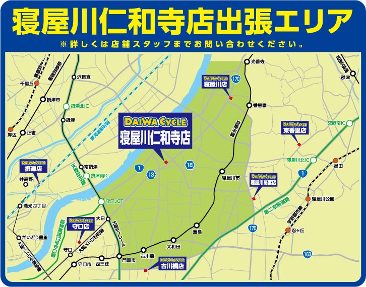 ダイワサイクル寝屋川仁和寺店 店舗情報:https://www.daiwa-cycle.co.jp/shop/neyagawaniwaji
