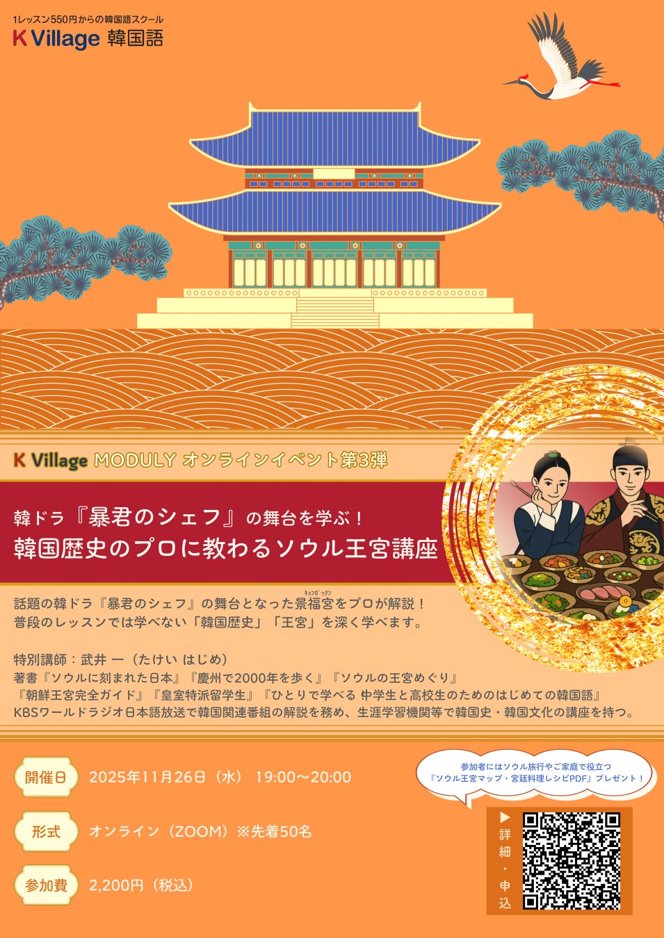 イベント名: K Village MODULYオンラインイベント第3弾―韓ドラ『暴君のシェフ』の舞台を学ぶ!韓国歴史のプロに教わるソウル王宮講座