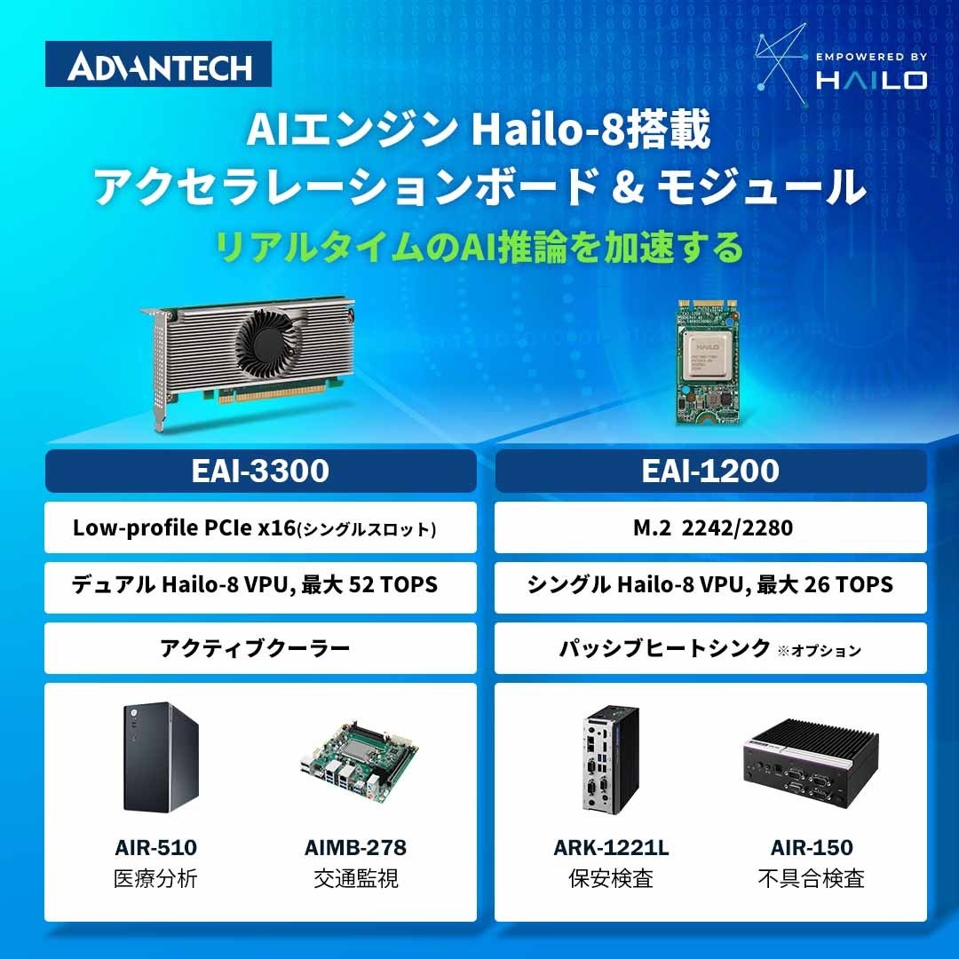 Advantech Co., Ltd (以下 アドバンテック)は、Hailo-8 AIエンジンを搭載した最新のAIアクセラレーションモジュールEAI-1200およびEAI-3300を発表し、発売を開始いたします。これらのモジュールは、同等のAIモジュールやGPUカードの12倍以上の電力効率を達成しながら、最大52TOPSのAI性能を実現します。