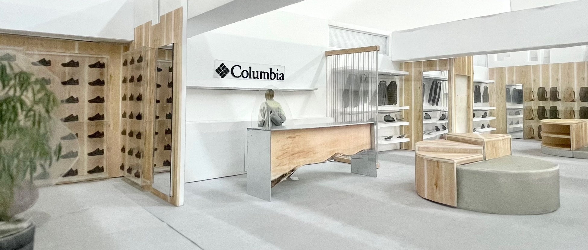 洗練された都会的な雰囲気とウッドやストーンなどの自然素材が生み出す温もりが調和する空間に、ヒストリーウォールやコロンビアを代表する商品やプリント柄などからインスピレーションを得たインテリアを配置し、来店いただいたお客様にコロンビアの世界観を感じながら楽しくお買い物をしていただける演出を施しています。また外装には大型のLEDビジョンを配し、映像を通してアウトドアの世界観を表現します。