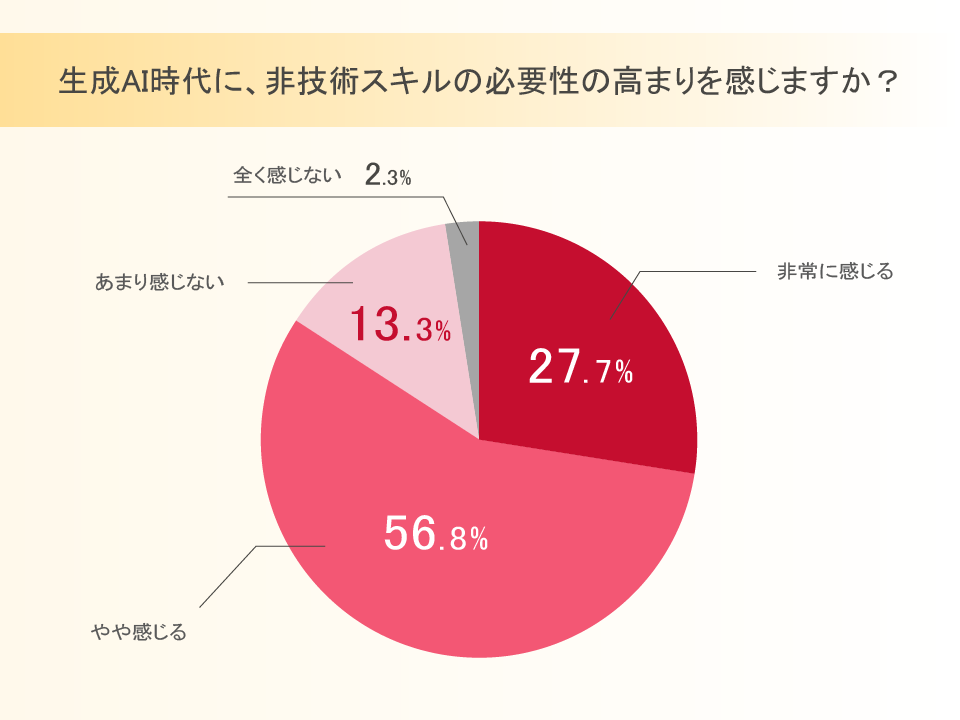 生成AI時代に、非技術スキルの必要性の高まりを感じるかたずねたところ、非常に感じるが27.7%、やや感じるが56.8%と、8割以上が非技術スキルの必要性を感じていることがわかりました。