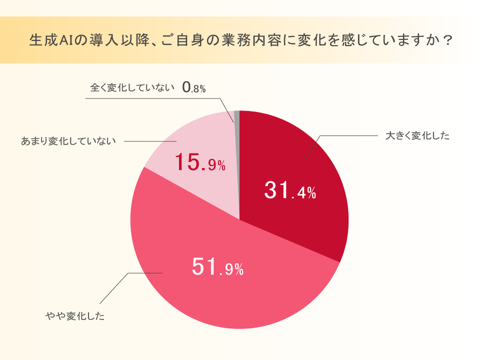 生成AIの導入以降、業務内容が「大きく変化した」が31.4%、「やや変化した」が51.9%と、8割以上のITエンジニアが変化を実感