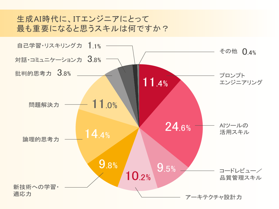 生成AI時代に、ITエンジニアにとって最も重要になると思うスキルをたずねたところ、最も多かったのは「AIツールの活用スキル」で24.6%、続いて「論理的思考力」が14.4%、次に僅差で「プロンプトエンジニアリング」11.4%、「問題解決力」11.0%が続きました。