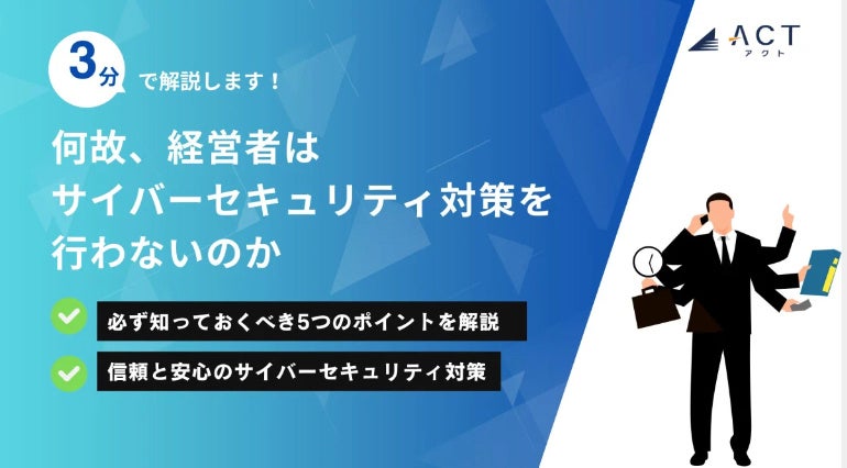 今年30周年を迎え、サイバーセキュリティ事業などを行う株式会社アクト(本社:東京都文京区、代表取締役CEO 小林 智彦 、以下 アクト)は【3分で解説!何故、経営者はサイバーセキュリティ対策を行わないのか】のホワイトペーパーを公開しました。