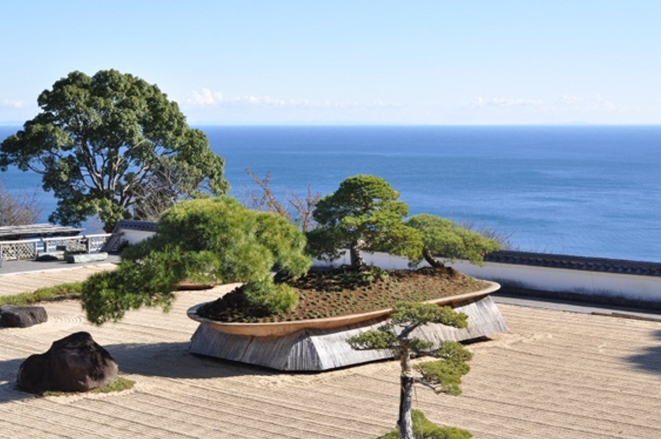 この枯山水式の日本庭園は、世界最大級の盆栽「鳳凰の松」や、横に流れるように伸びる「流星の松」など、ユニークな盆栽を展示しています。庭園は相模灘を借景としており、青く澄み渡る空と海の雄大な景観が広がります。枯山水の周りは芝桜で縁取られ、周囲には枝垂桜やあたみ桜など日本らしい植物が植栽されています。施設内でも平面を広く活用できる数少ないエリアであり、COEDA HOUSEと隣接しているため、多くのお客様が訪れやすい場所となっています。