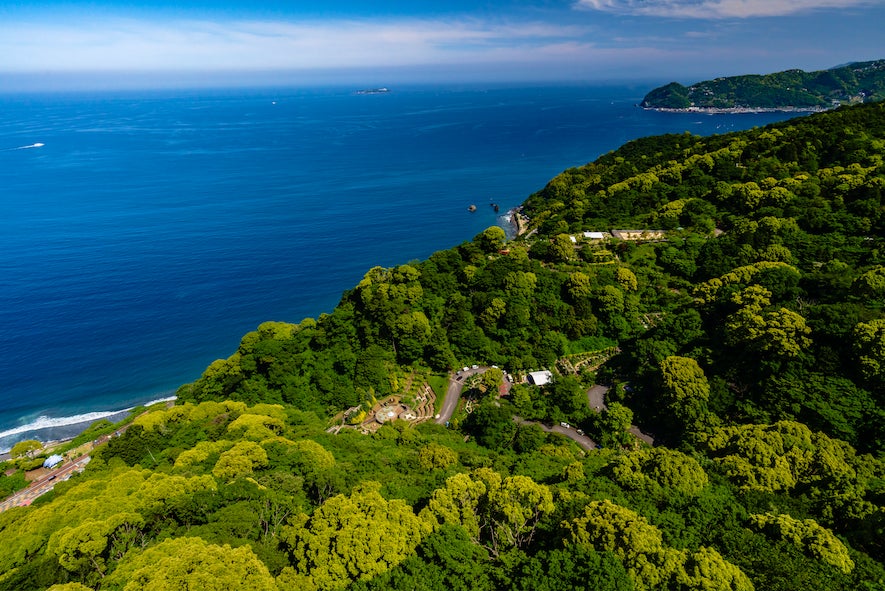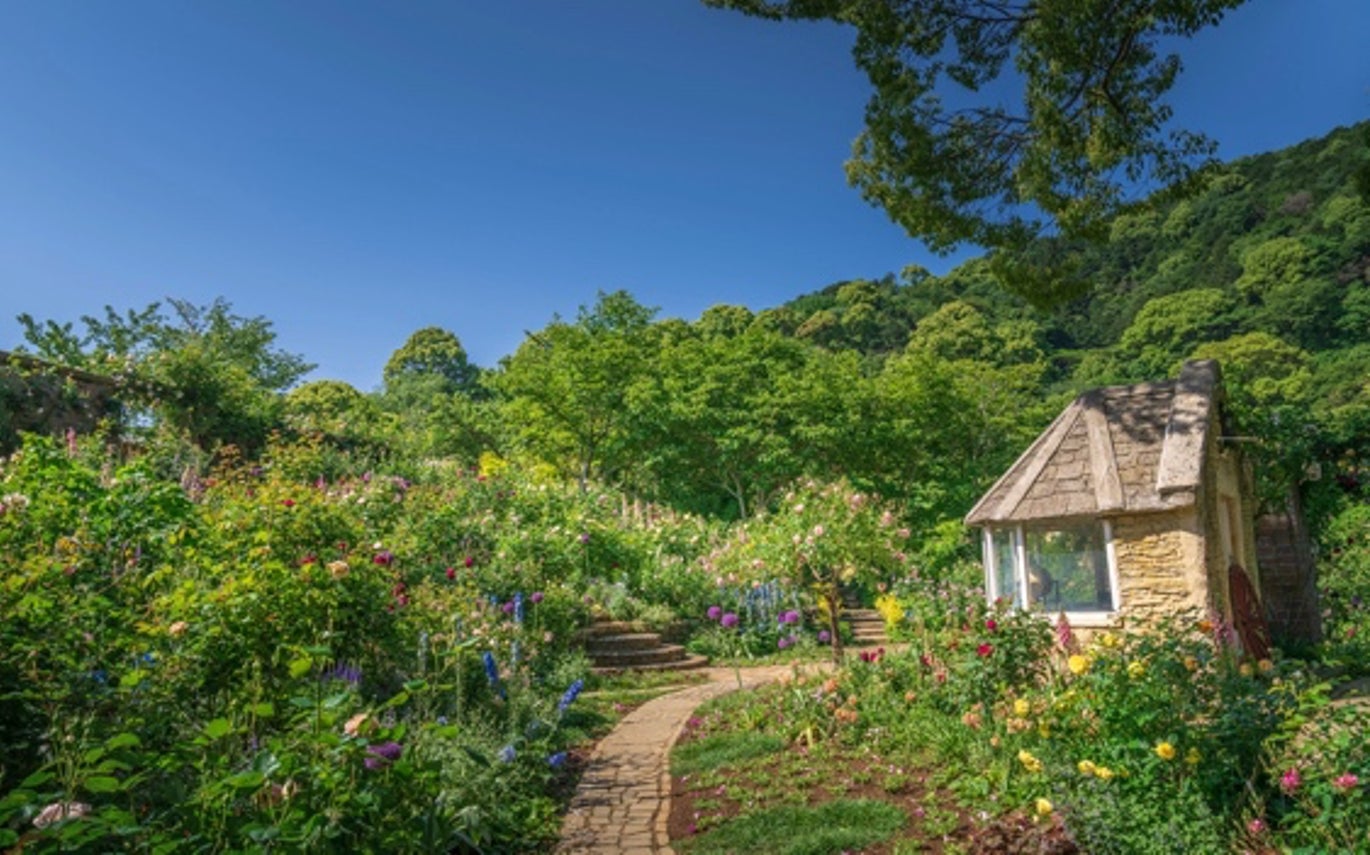 熱海ブルーに輝く海と空を借景に、季節の花々やハーブが咲き誇り、アートなども五感で楽しむことができ、園内には、隈研吾氏設計のカフェ「COEDA HOUSE」をはじめ、曽我浅間神社があります。