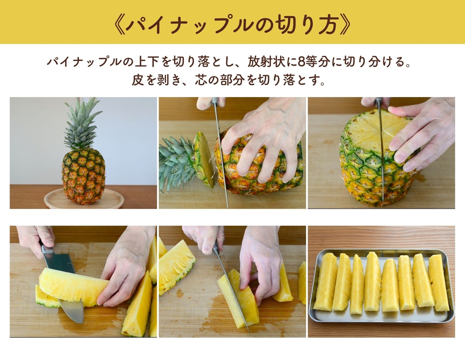 今回のレシピで紹介しているパイナップルは、下記のような手順でカットしています。