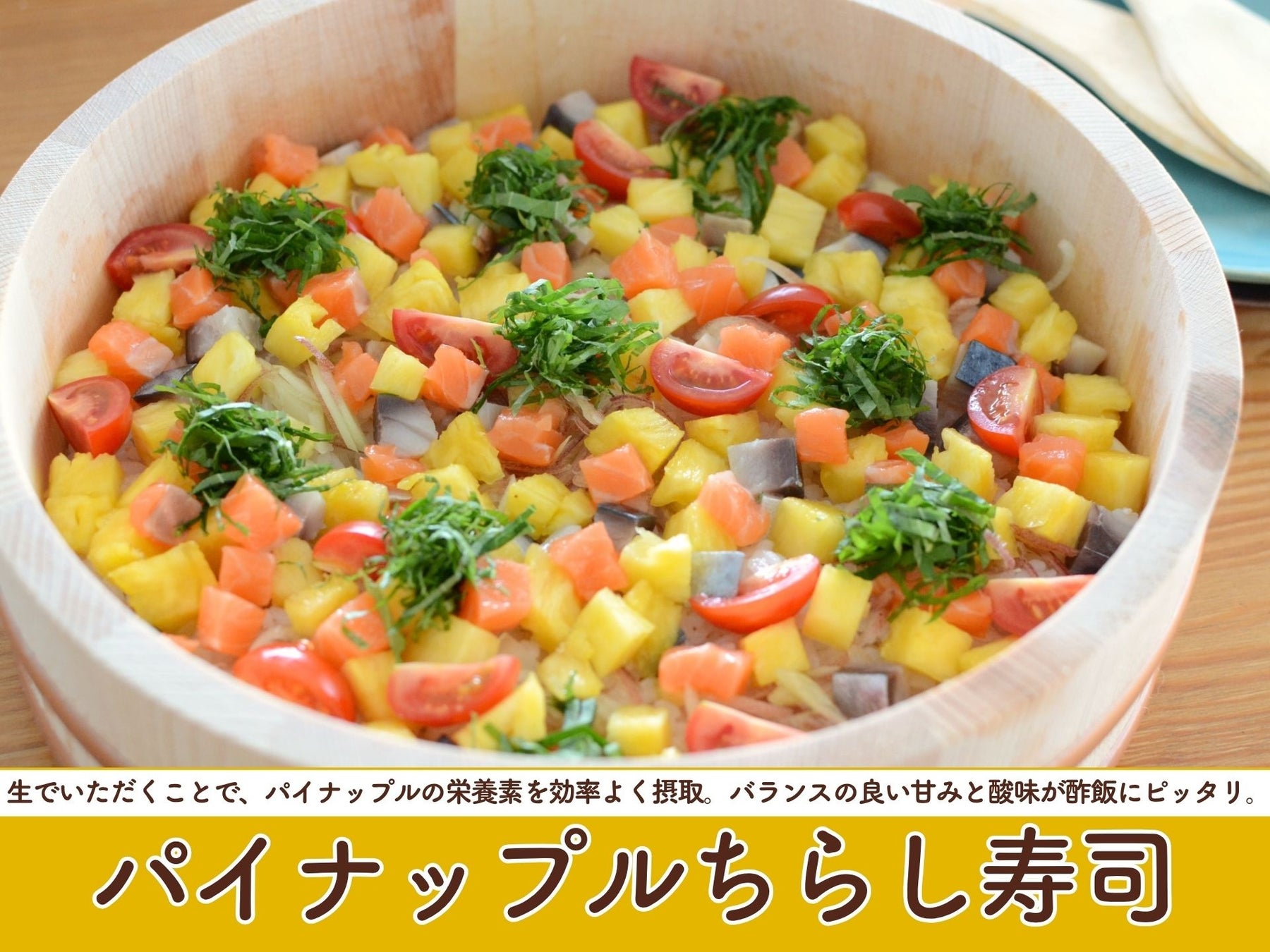 「パイナップルに含まれるビタミンCには抗酸化作用があり、<老化予防と美肌のビタミン>などと言われています。サーモンなどに含まれるビタミンEと一緒に摂ることで相乗効果が働き、抗酸化作用がより高まります。他にもビタミンCはコラーゲンの合成に必要不可欠なビタミンで、免疫力向上、鉄分の吸収促進、肌のシミの原因となるメラニン色素の生成を抑えるなど、様々な効果が期待できます。加熱に弱い栄養素なので、今回のように生で食べると効率よく摂取することができます。パイナップルのバランスの良い甘み・酸味が酢飯によく合います。酢飯はラップに包んで冷凍保存可!お好みでトッピングを変えて作ってみてください。」