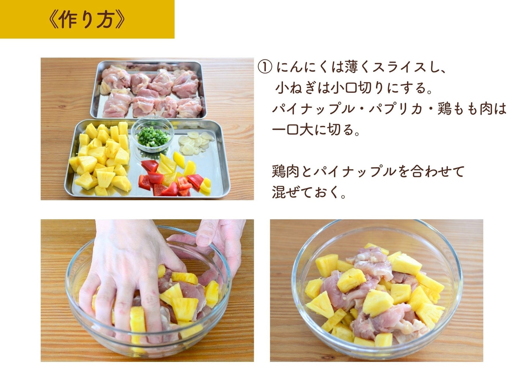 「パイナップルのタンパク質分解酵素が生肉に働き、食感を柔らかく仕上げてくれます。パイナップルが生の状態で生肉に合わせて混ぜておくこと(作り方①)がポイントです。