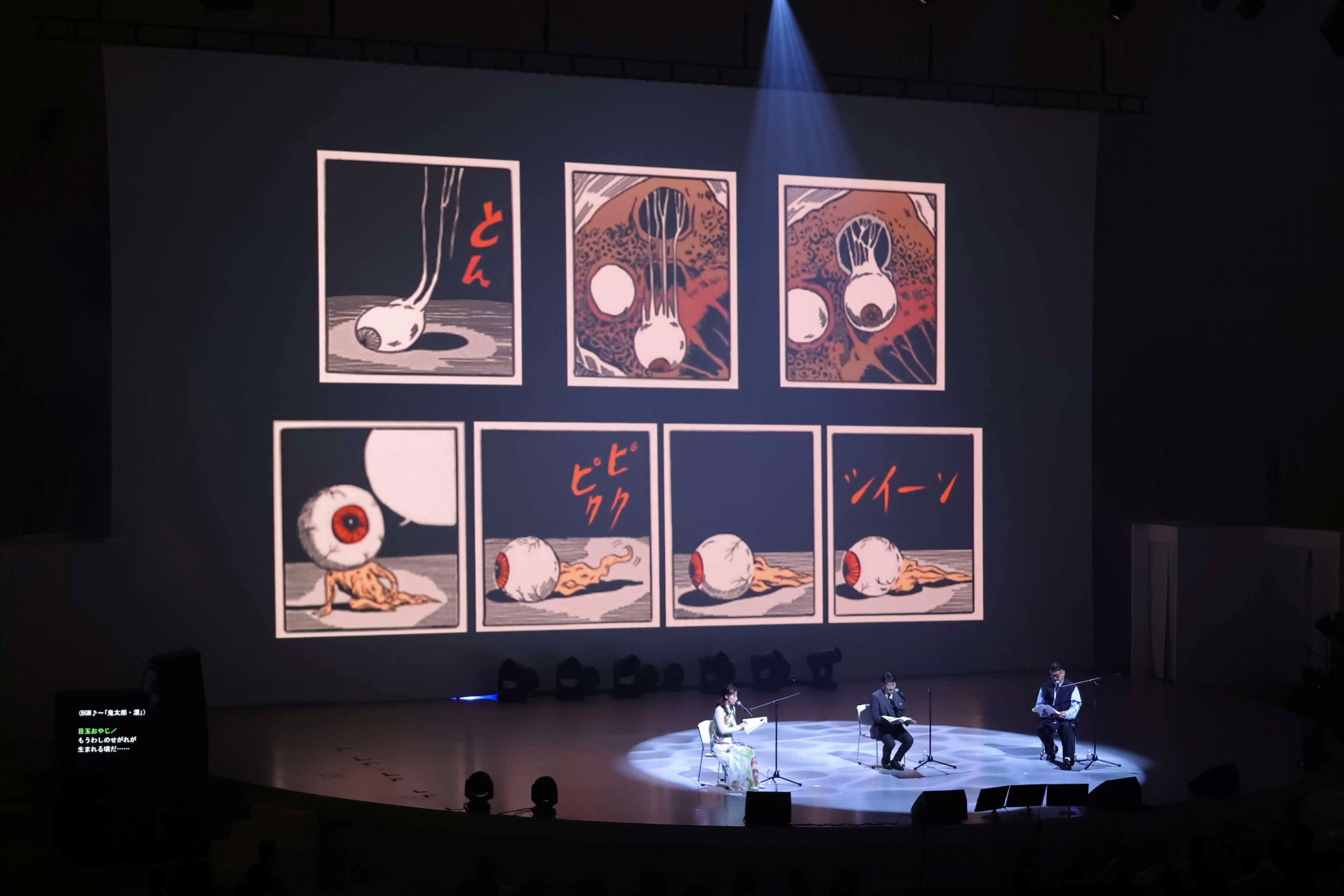 続いて、まんが王国とっとり「水木しげるの世界」朗読劇が開幕。映画「鬼太郎誕生 ゲゲゲの謎」で鬼太郎の父役の関俊彦さん、水木役の木内秀信さん、鳥取県出身の下田麻美さんが登壇し、「ゲゲゲの鬼太郎 鬼太郎の誕生 万博スペシャルバージョン」を朗読いただきました。御三方の演技に一気に「ゲゲゲの鬼太郎」の世界に誘われ、平井県知事も「とても感激しました。この子の未来が見とうなった」とコメントし、集まった約1,900人の観客から大きな拍手が送られました。