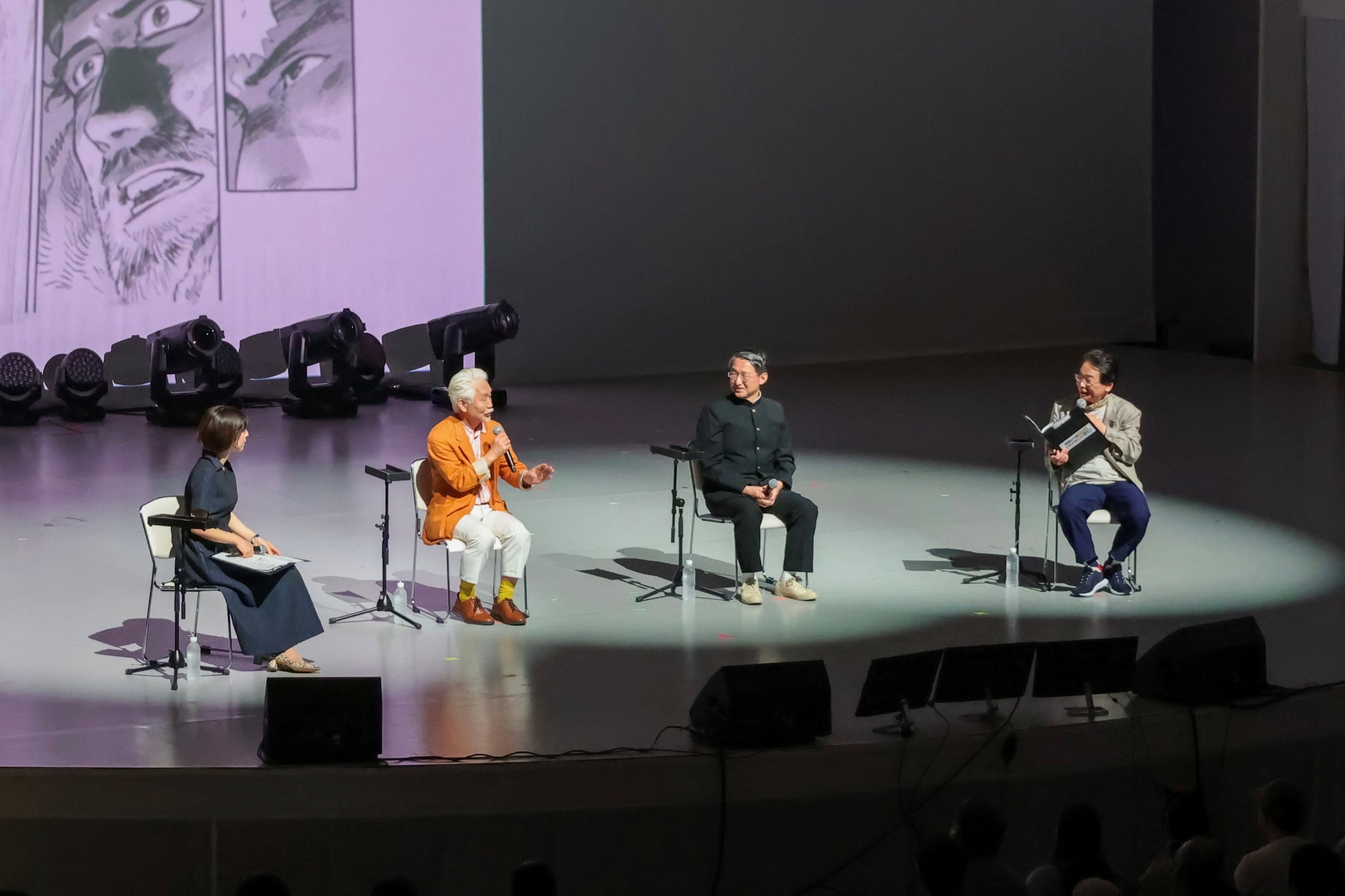 三つの大迫力の郷土芸能で会場のボルテージが高まると、鳥取県にゆかりのある三人の巨匠 谷口ジロー先生、水木しげる先生、青山剛昌先生の作品をテーマとしたステージに移り変わります。はじめに漫画コラムニストの夏目房之介さんが登場し、「谷口ジローの世界観」をテーマにトークを行いました。夏目さんは谷口作品の魅力を「フランスでも高い評価を受けており、風景で物語を描く大人向けの漫画が魅力。遥かな町へは何回読んでも最後の方に感動して泣いてしまう作品なので、とても楽しみにしている」と語り、今年8月に鳥取県倉吉市でクランクインする「遥かな町へ」へ期待を寄せました。