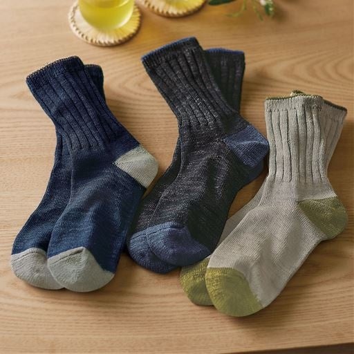 色は、写真左からネイビーブルー、ブラック、グレージュの、お洋服にも合わせやすい3色からお選びいただけます。サイズは、23cm~25cm。環境に優しいエコな靴下で、夏の暑さ対策にもおすすめの商品です。ぜひ一度、はき心地をお試しください!