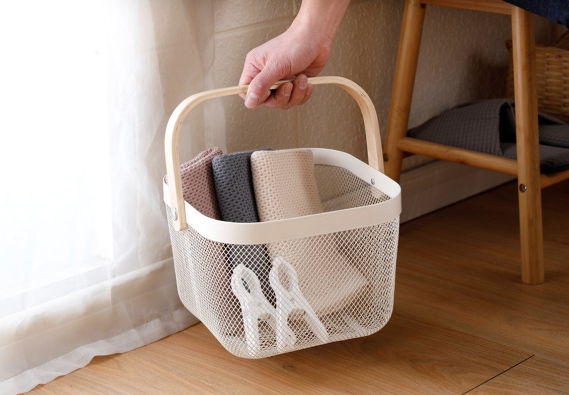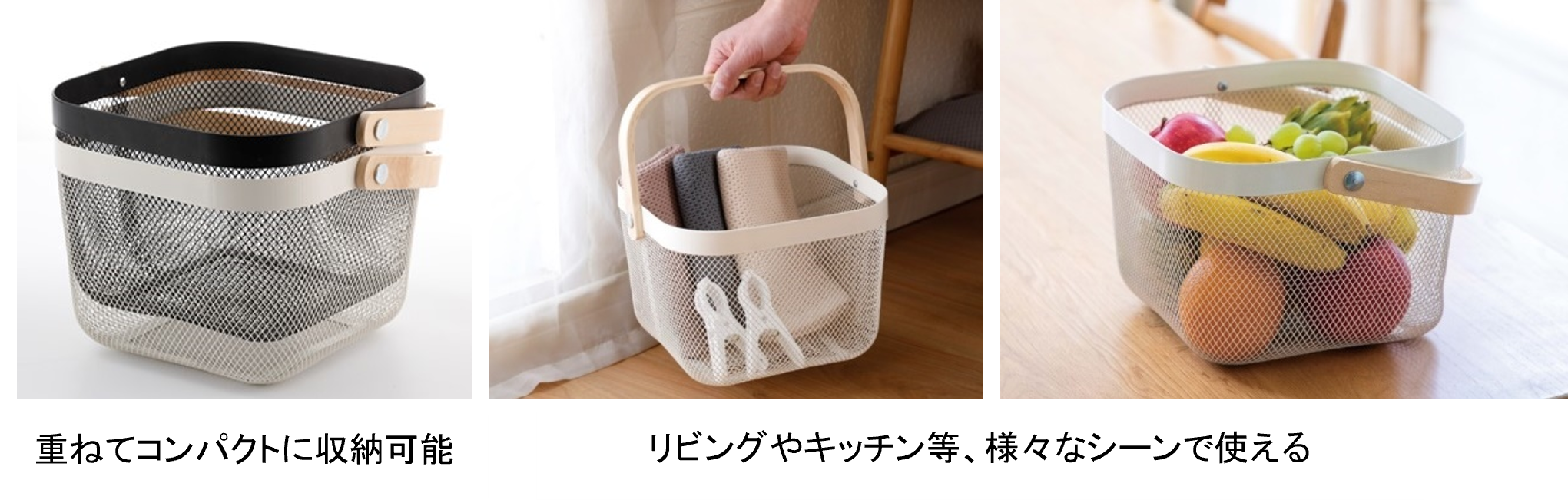 小物や食材、衣類やおもちゃなど、おうちの収納にかかせないアイテムとなっているのがバスケット。今回発売する「メッシュバスケット」は、ぬくもりを感じる木製の持ち手とアイボリー/ブラックのシンプルな2色のカラーリングで、様々なインテリアに馴染む収納アイテムです。メッシュ仕様で中身が見えて、通気性もよいため洗濯物を取り込む際にもお使いいただけます。実用性とデザイン性を兼ね備えた「メッシュバスケット」で、お部屋をおしゃれに整理整頓してみてはいかがでしょうか。