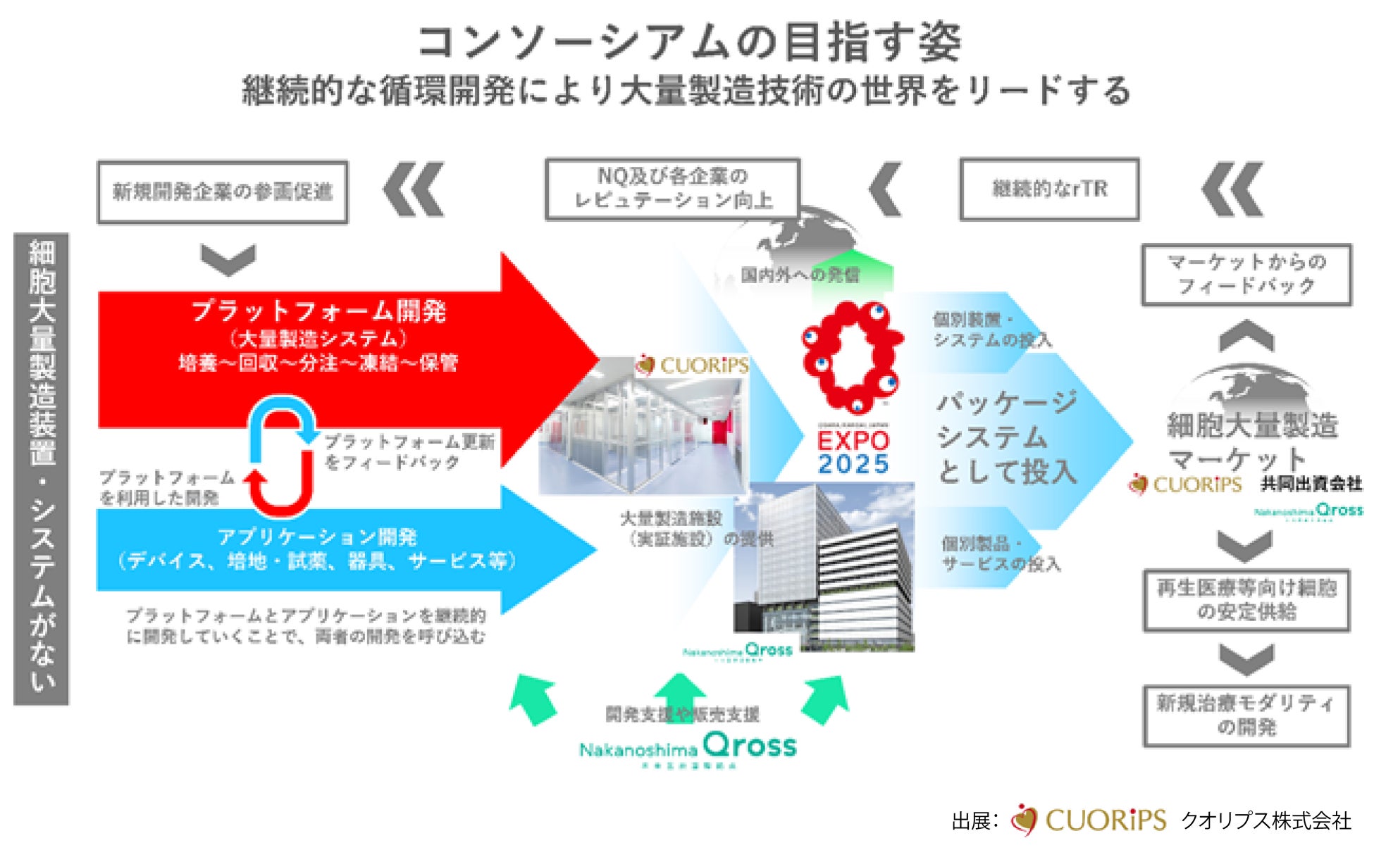 本コンソーシアムは、クオリプス株式会社(本社:東京都中央区日本橋本町、代表取締役社長 草薙 尊之)が形成し、開発拠点を今夏に稼働予定の中之島未来医療推進拠点(Nakanoshima Qross)に置き、かねてより各社と進めてきた要素技術の開発に基づき、パイロットスケールで製作するプラットフォームシステムを導入する予定です。さらに本コンソーシアムでは、アプリケーション開発を推進し、継続的かつ持続的な開発を進めると同時に、細胞培養加工施設への導入や商用レベルでの実証を行うことも計画しています。