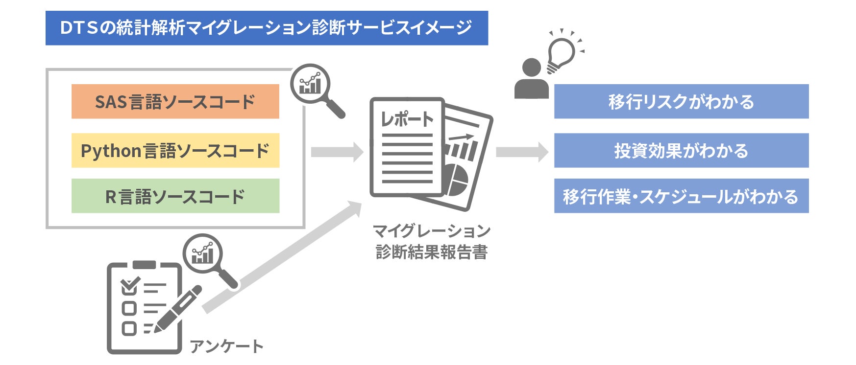 本サービスは、DTSがこれまでに提供してきた『統計解析プラットフォームソリューション』の導入コンサルティングを通じて培われた豊富なナレッジを活用し、利用中の統計解析資源の分析と数回のヒアリングで、統計解析プラットフォーム移行に伴う環境移行のリスク、コストを簡単に見える化します。それに伴い、移行によるコスト削減効果を簡単に把握できます。