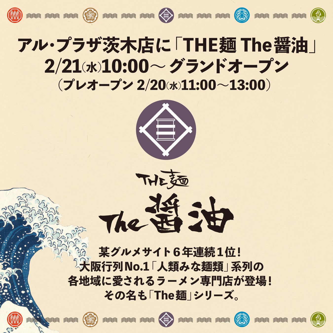 大阪行列No.1ラーメン店「人類みな麺類」を運営するUNCHI株式会社(本社:大阪市淀川区、代表取締 役:松村貴大)は、各地域のマーケットに合わせて醤油、豚骨、味噌、塩などブランドを選べて、その店に特化したラーメンを展開する新ブランド「The麺」シリーズとして「The麺 The醤油 アル・プラザ茨木店」を2月21日(水)10時にグランドオープンいたしました。
