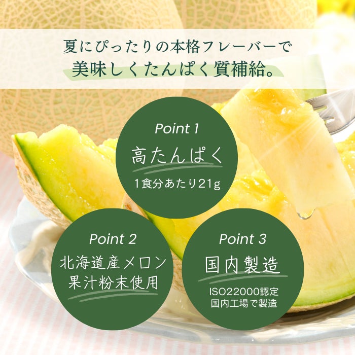 7/23(火)に北海道産の青肉メロン果汁パウダーを使用したホエイプロテイン(WPC)芳醇メロン味が新発売!ジュースかと思えるほどの爽やかな味わいで、暑い夏にピッタリなフレーバーに仕上げました。