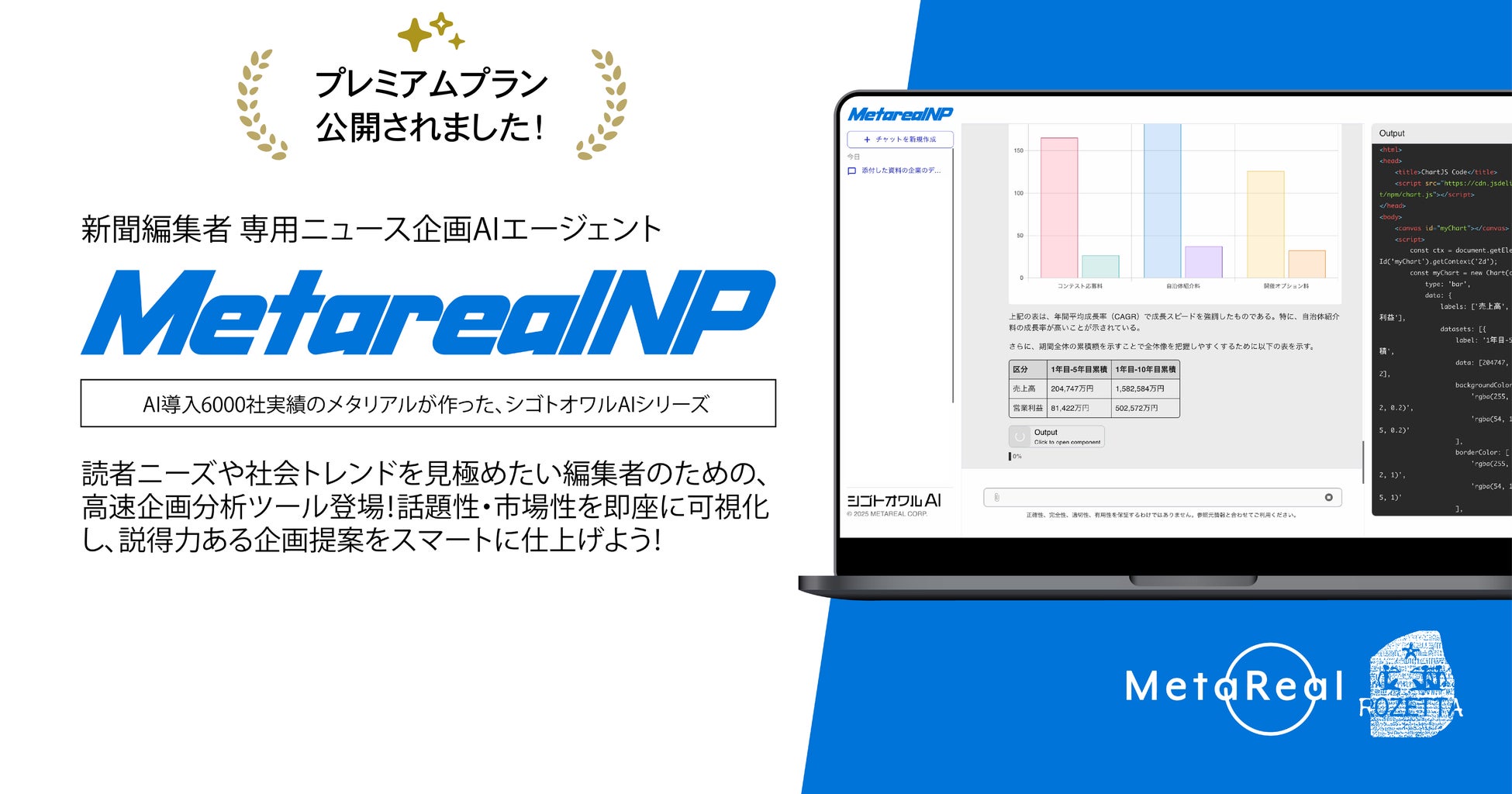 業種特化の専門AI開発・運営を行う株式会社メタリアル(本社:東京都千代田区、代表取締役:五石順一)は、新聞編集者専用ニュース企画AIエージェント「Metareal ニュースペーパー」(以下、Metareal NP) を月額5万円(税込)で、1日最大20回、月200回までご利用できるプレミアムプランの提供を開始しました。