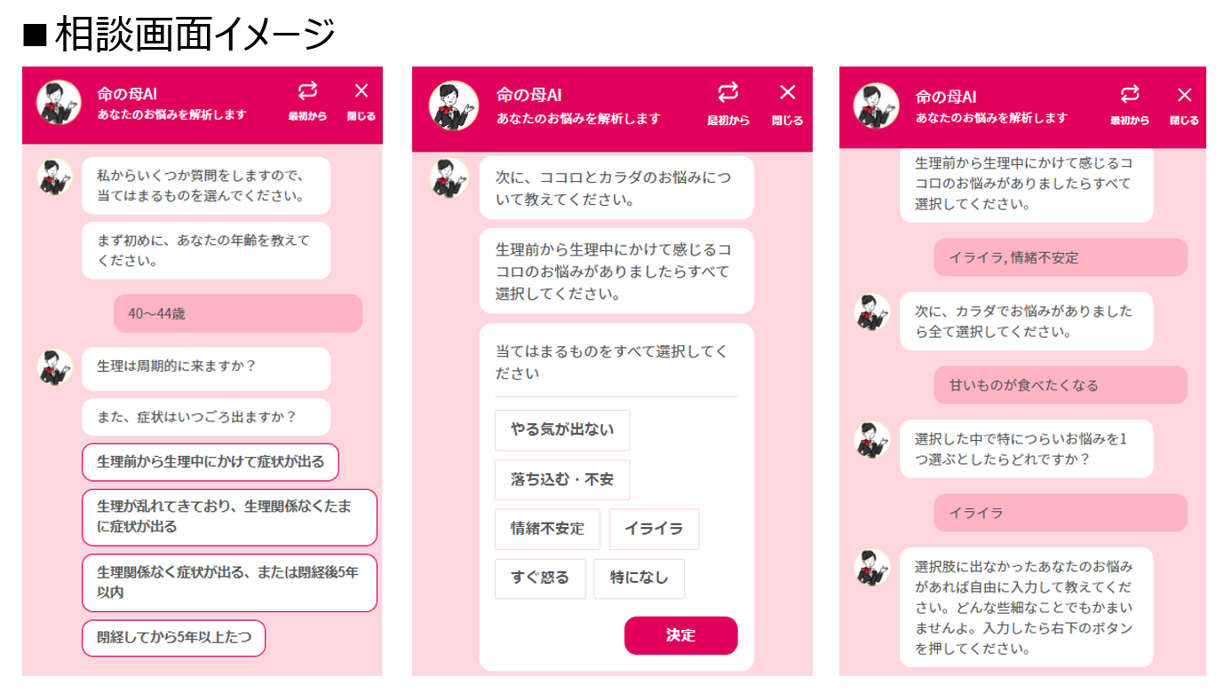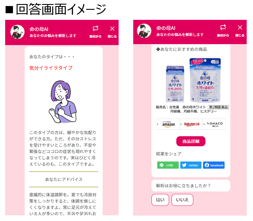 AIによって、ご相談者様のお悩みと命の母の研究で培ったビッグデータをマッチングさせ、監修医によるアドバイスや、同じように悩んでいる方の声、適した商品をマッチングします。